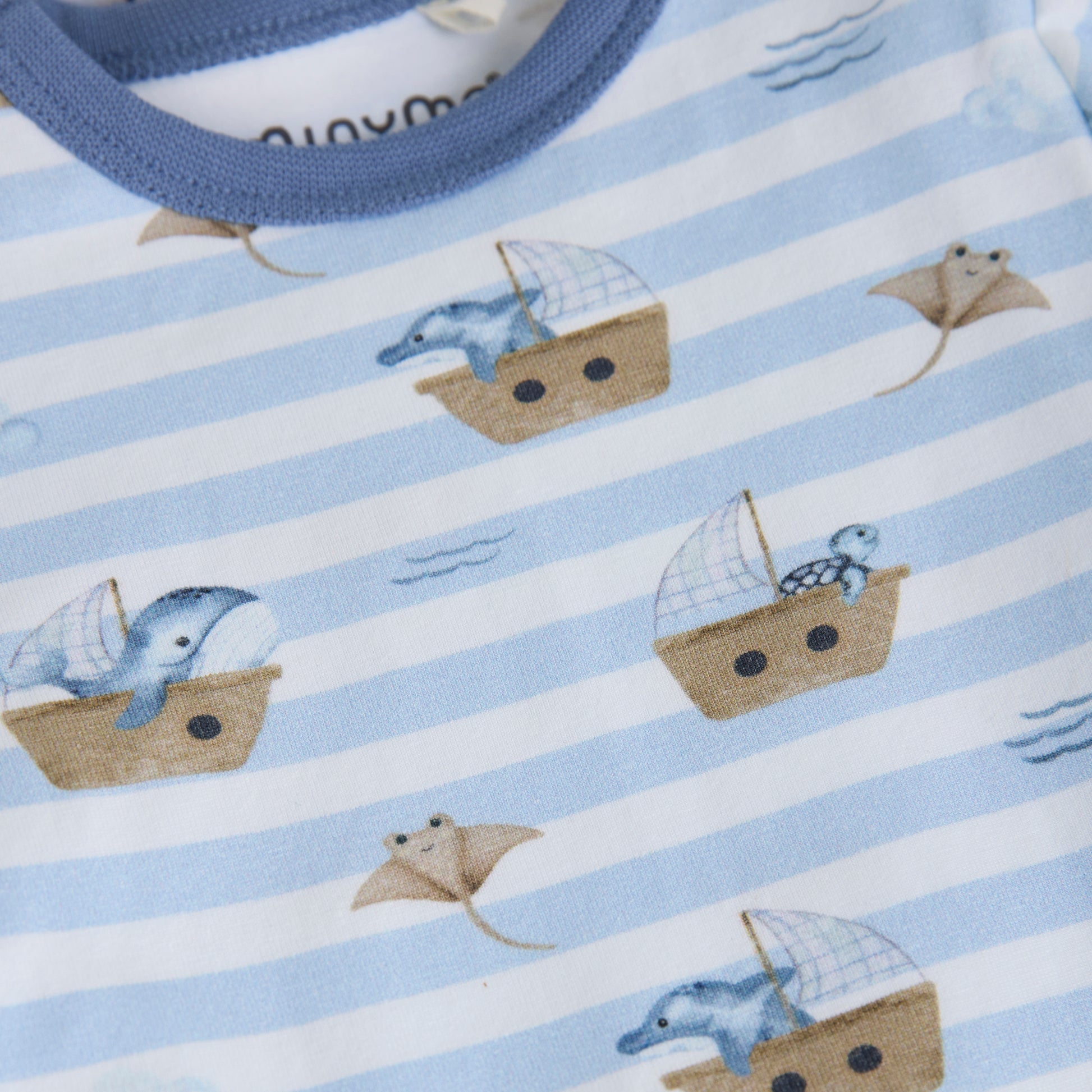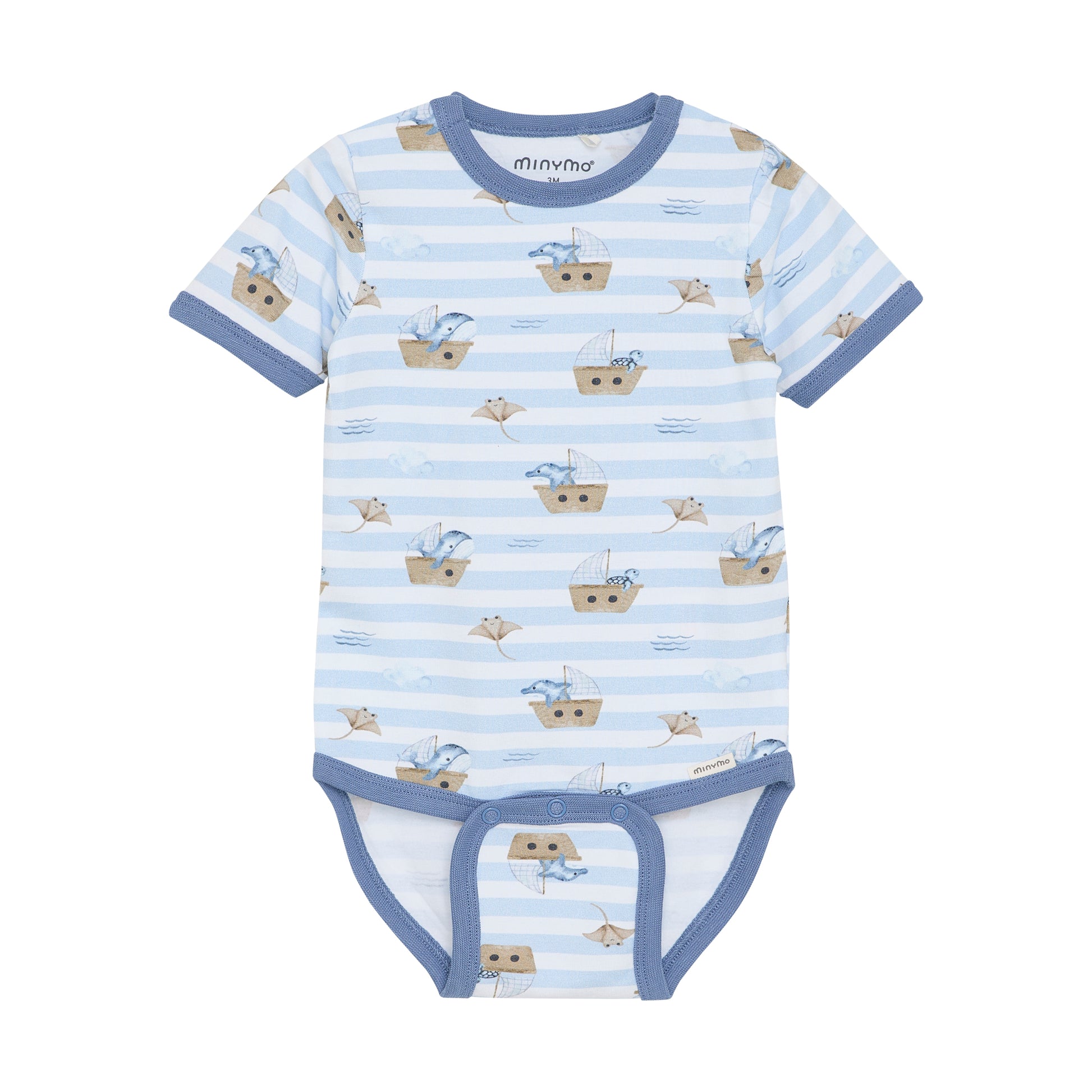 Beautiful short-sleeved body with allover print from Minymo. The body is made in a comfortable cotton blend and has a nice sea-inspired print with stripes all over. The body closes with hidden snaps on the shoulder and snaps between the legs. Certified acc. to GOTS - organic CERES-0366
