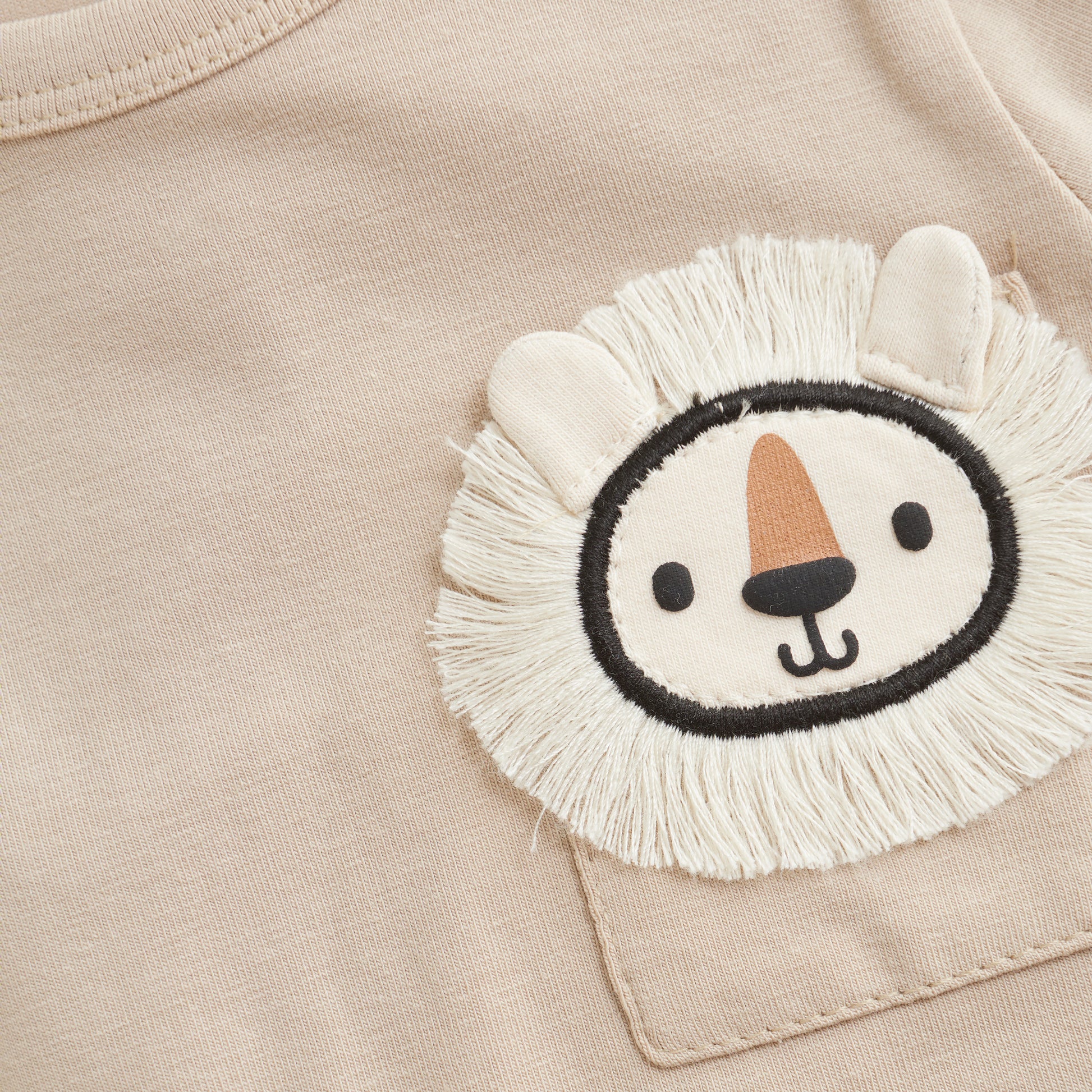 Plain long-sleeved body from Minymo with a cute chest pocket featuring a lion motif. Made from a soft cotton blend that feels comfortable against the skin. Fastens with snap buttons between the legs. Minymo logo near the leg.