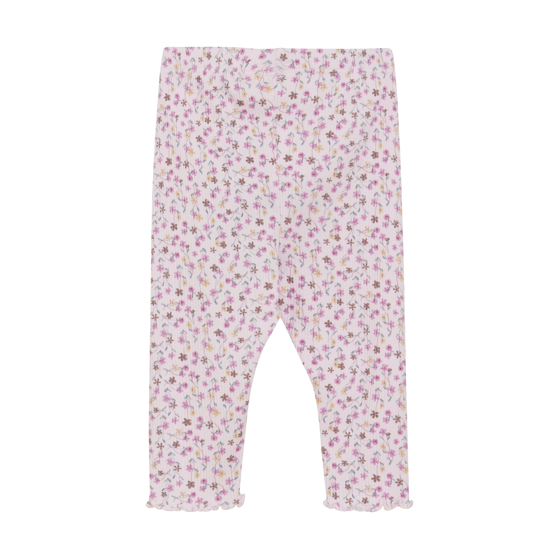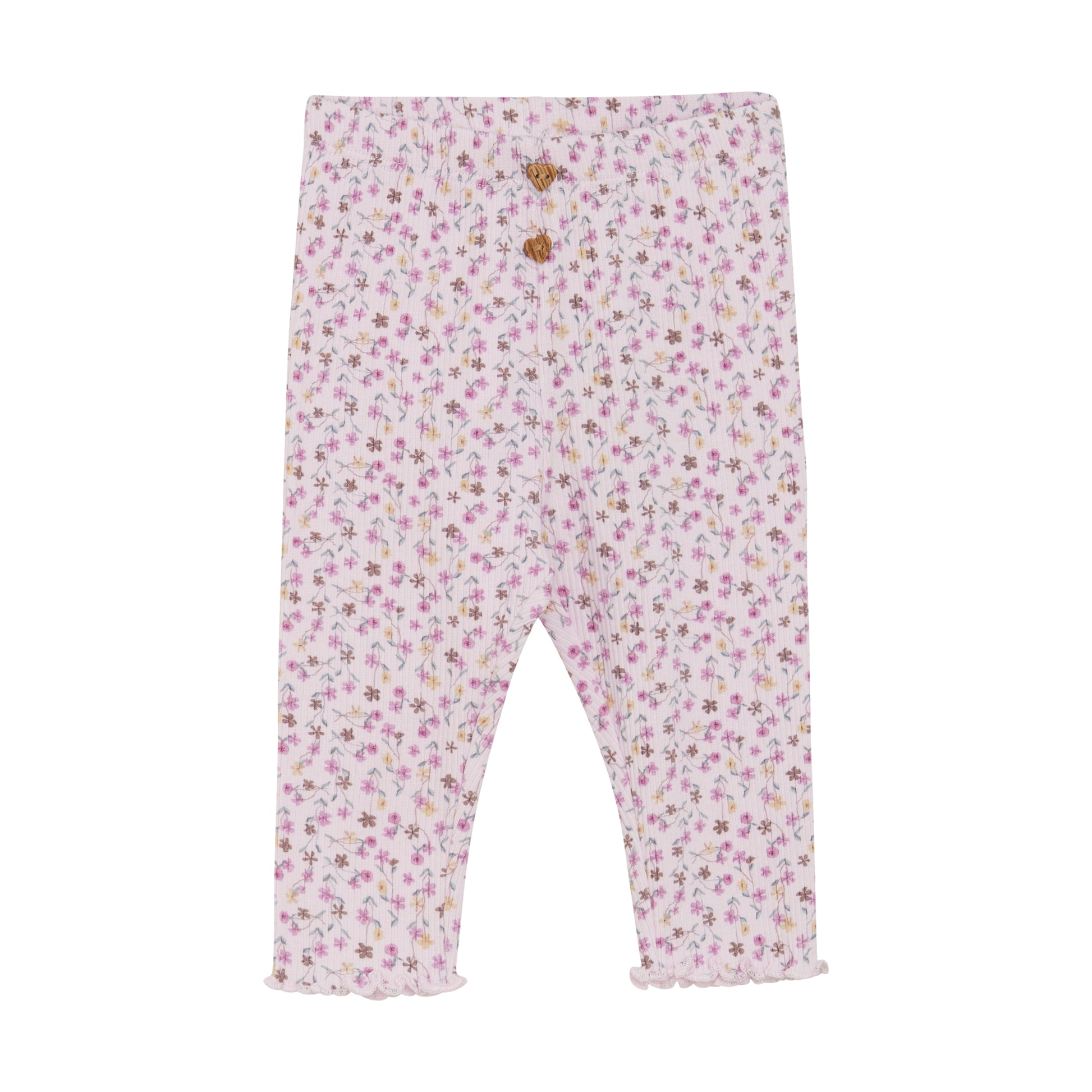 Cute leggings in a soft and comfortable cotton rib. The pants feature a lovely floral print and charming details such as frills at the ankles and beautiful heart-shaped wooden buttons.