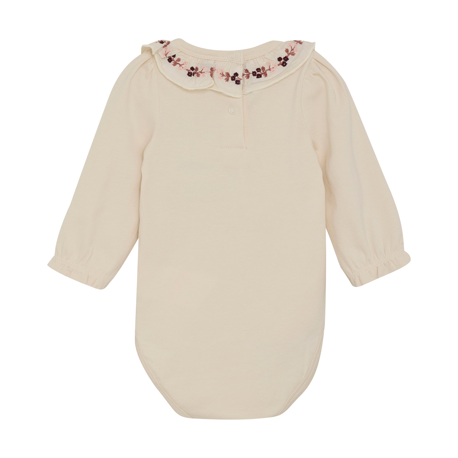 Cute long-sleeve bodysuit featuring a beautiful collar adorned with embroidered floral details. The bodysuit has elasticated cuffs, creating delicate frill details, and snap buttons at the neck and between the legs for easy dressing.
