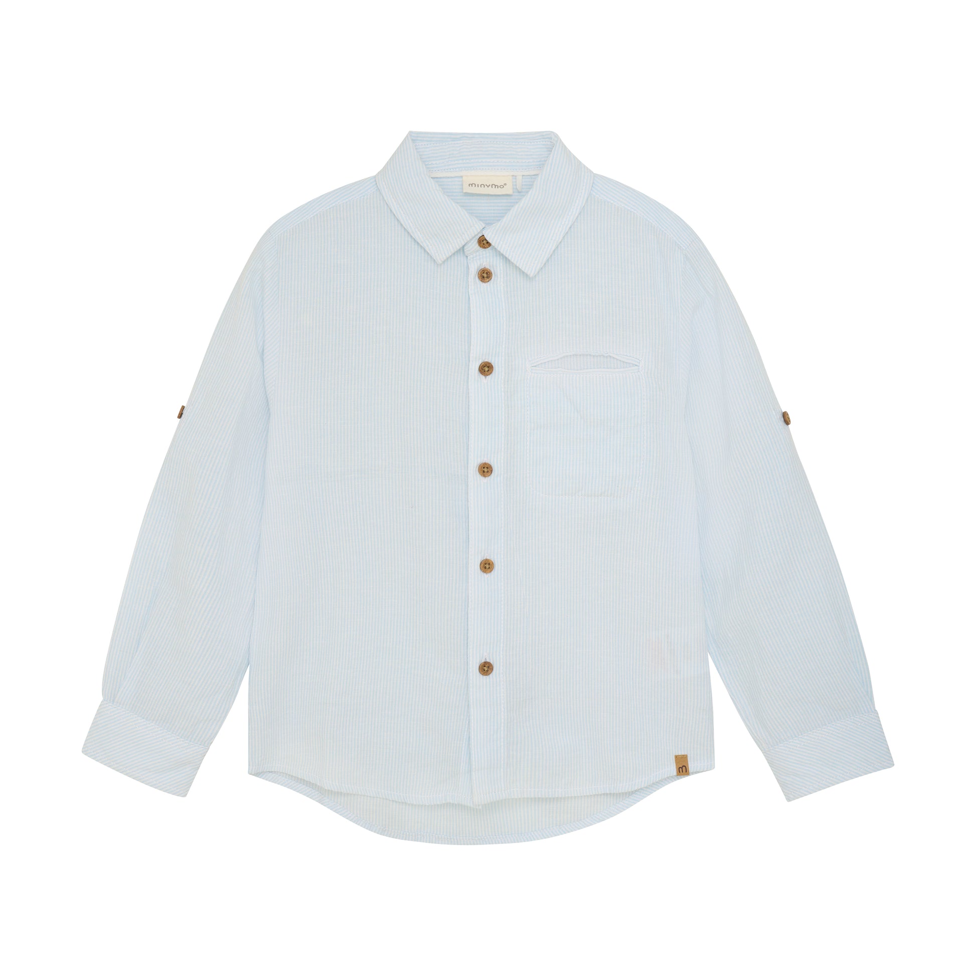 Nice striped long-sleeved shirt from Minymo. The shirt is made of 100% cotton and has nice stripes. The shirt closes with buttons at the front. There are buttons at the wrists, which make it easier to put the shirt on. The sleeves can be rolled up and fastened with buttons on the sleeves. Small pocket on the chest.