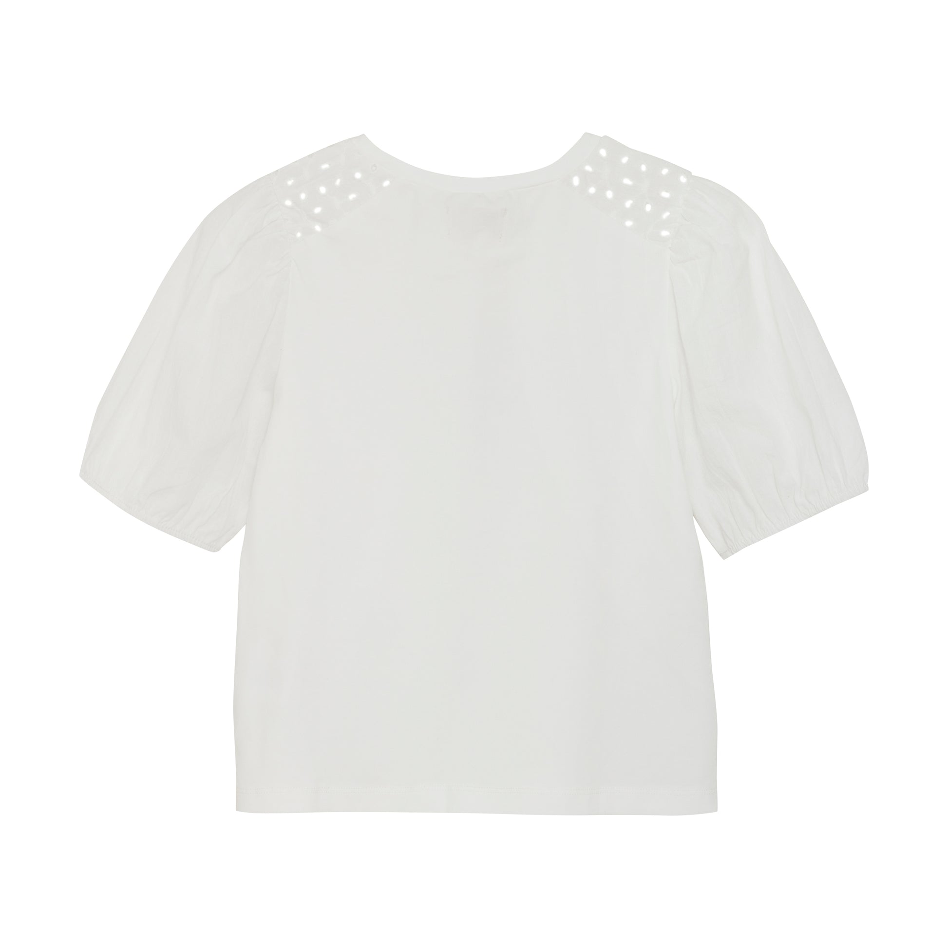Short-sleeved T-shirt with delicate lace details, adding a feminine touch. Made from soft organic cotton for extra comfort. Perfect for both everyday wear and special occasions. Creamie.