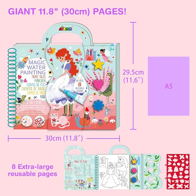 - Comes with 8 magic water painting pages, a refillable water pen, a reusable stencil and 3 water stamps