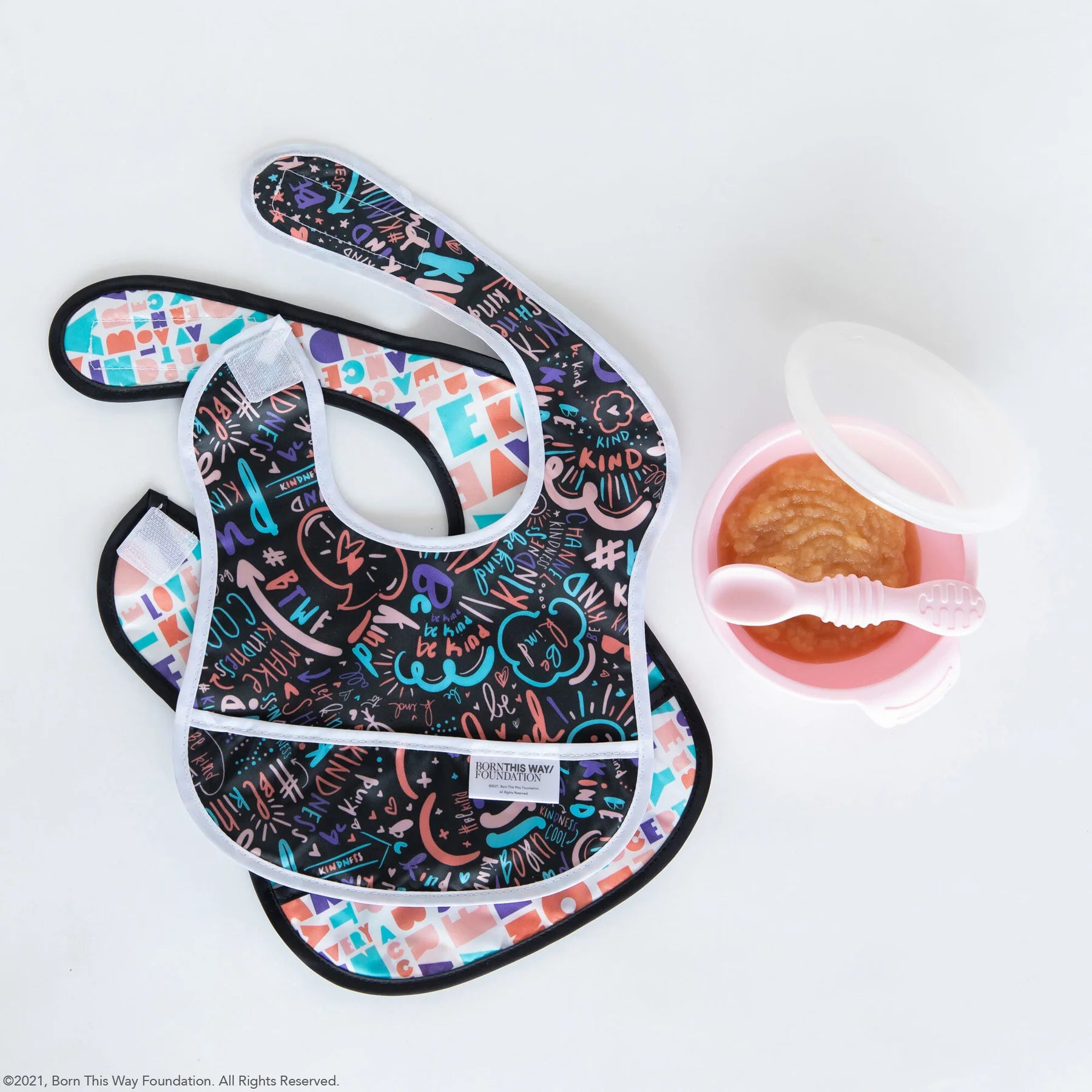 It’s never too early to teach them to be kind. Perfect for baby’s first foods, these Born This Way Foundation by Bumkins Starter Bibs attach over the back of the shoulder with a hook-and-loop closure for a quick, adjustable, and tug-proof fit and feature a large catch-all pocket to help contain spills, crumbs, and more. Starter Bibs are made from Bumkins’ lightweight, durable, waterproof fabric that is resistant to stains and odors. Its single-ply construction means no worrying about icky stuff growing between layers of fabric. Wipeable and machine washable, these bibs are easy to clean, and a pack of two ensures you always have one handy! Born This Way Foundation by Bumkins is a partnership with the goal of promoting kindness and mental health awareness. A portion of each purchase supports Lady Gaga’s non-profit Born This Way Foundation’s mission of supporting youth mental health and working with them to build a kinder, braver world. Together, we can make kindness cool, validate the emotions of young people, and eliminate the stigma surrounding mental health.