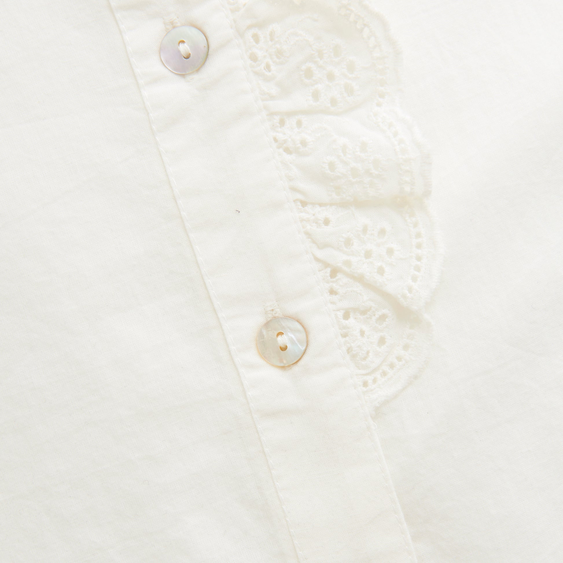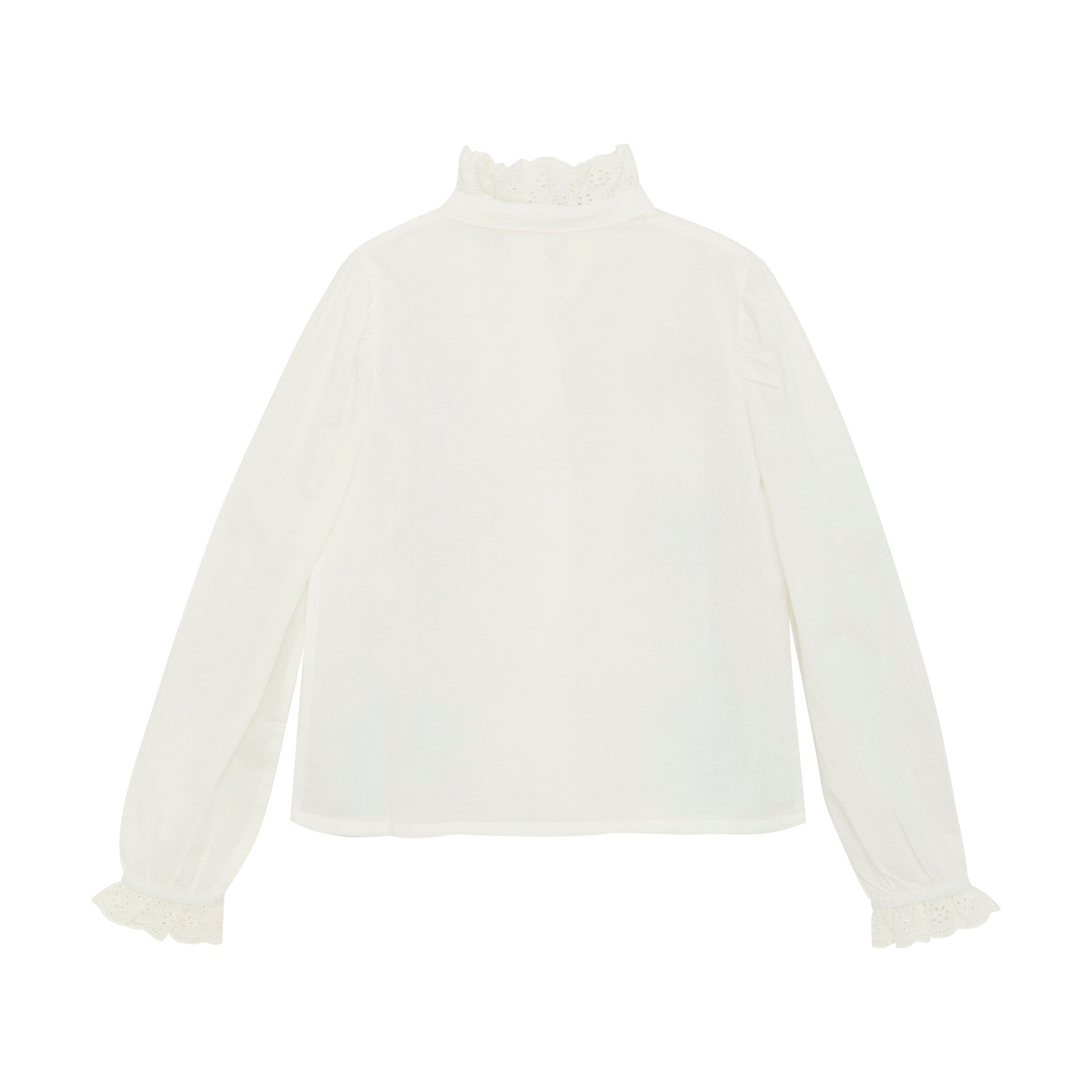 Elegant shirt with nice details. The shirt has a high frilled collar that goes down the closure. There are puff sleeves and the lace from the collar goes back into the sleeve openings. There are continuous buttons in the shirt.