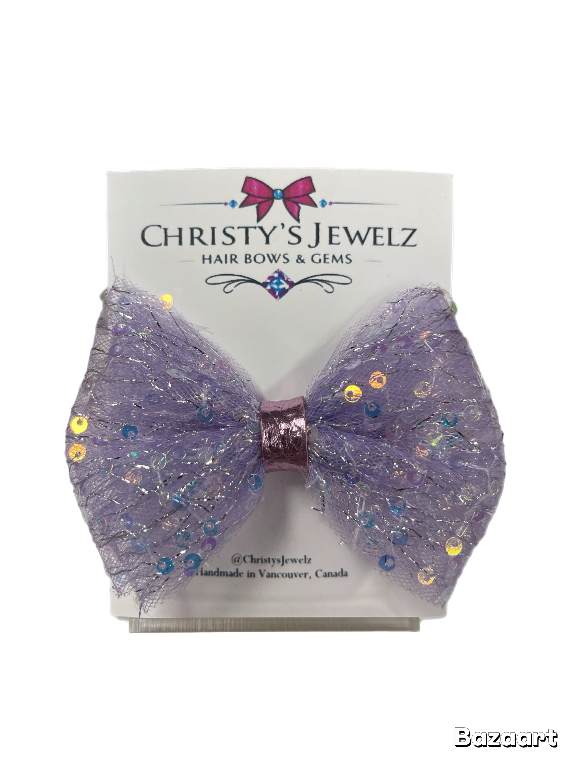 Christy’s Jewelz & Bows sequin hair bow. Featuring a metal alligator clip. Measures approximately 6 cm wide.