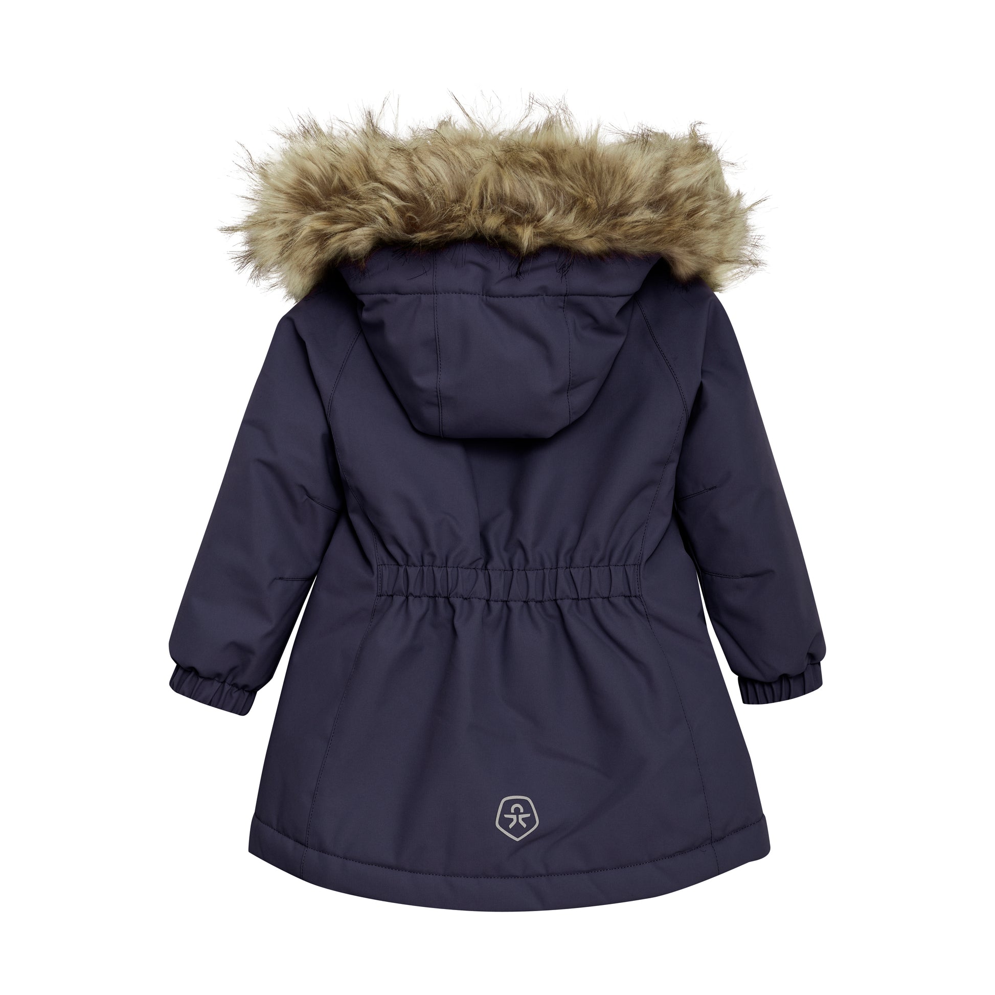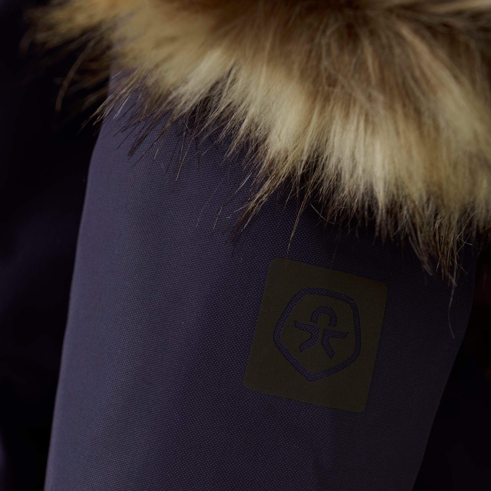 Warm parka jacket with a fixed elastik in the waist on the back for at tailored look. The jacket are made in durable and partly recycled material. The material is breathable, windproof and waterproof, so your child can stay out in rain, snow and wind without getting cold and wet. Tested wear resistance of >60,000 rubs, water column pressure of 10,000 mm. and breathability of 2,000g. The jacket closes with quality zips at the front and at the outer pockets. The chin protector ensures that the zipper feels soft under the chin. The jacket has a removable hood where the fake fur can be removed. Reflective details on the back and on the sleeve for increased visibility. With inside name tag for easy identification. Coated with BIONIC FINISH® ECO. Certified acc. to GRS - Made with more than 50% Recycled Material