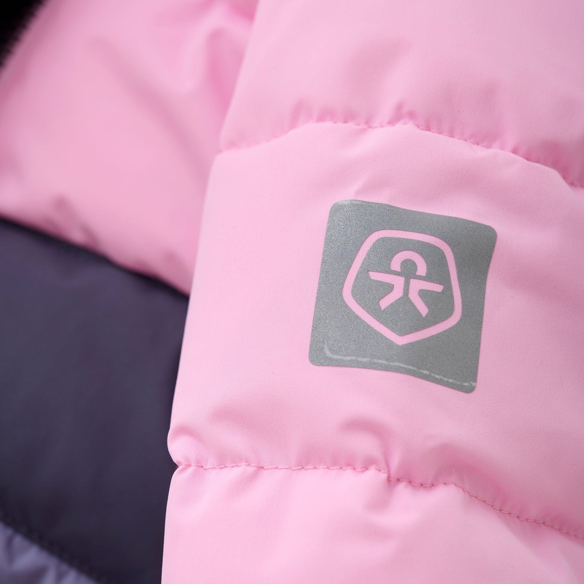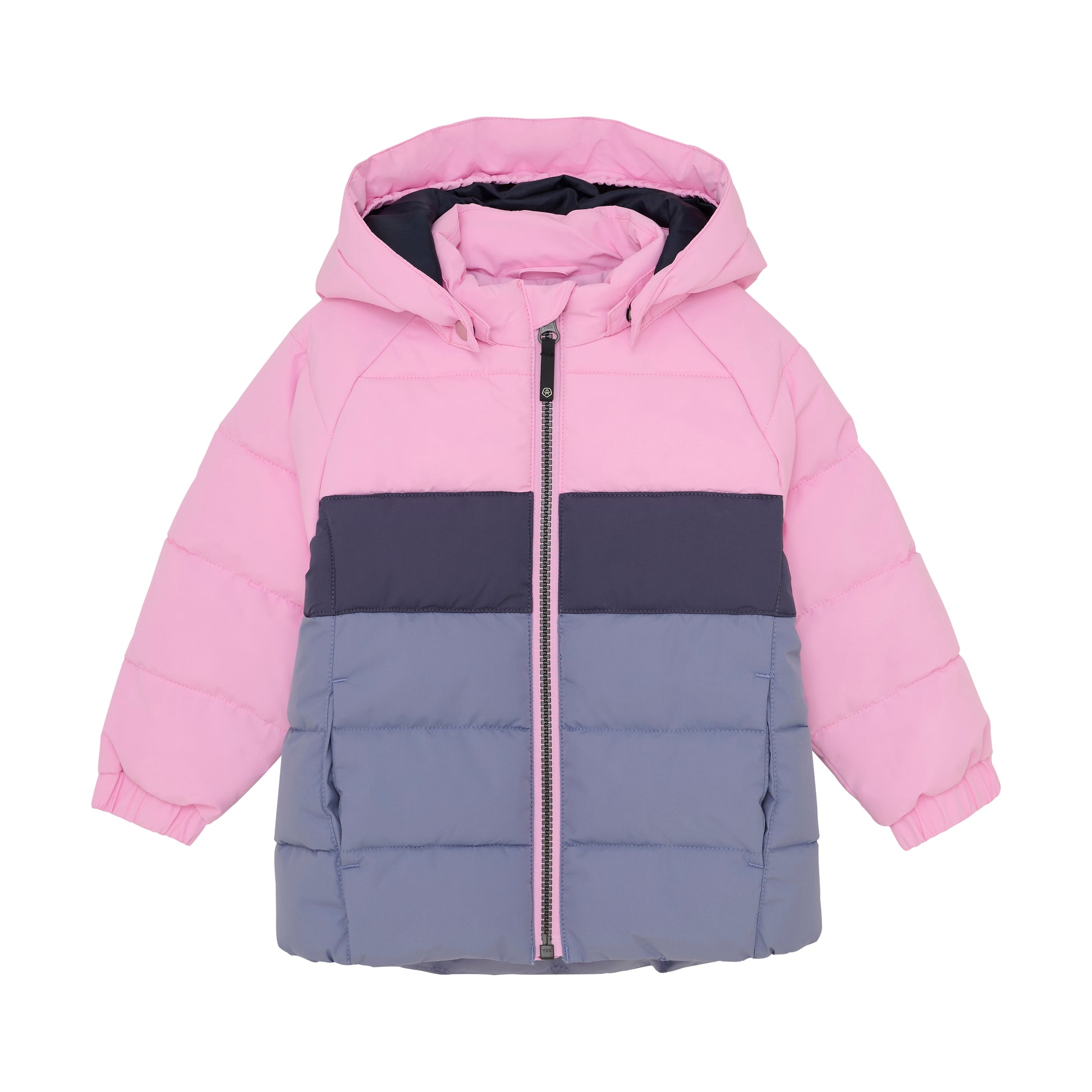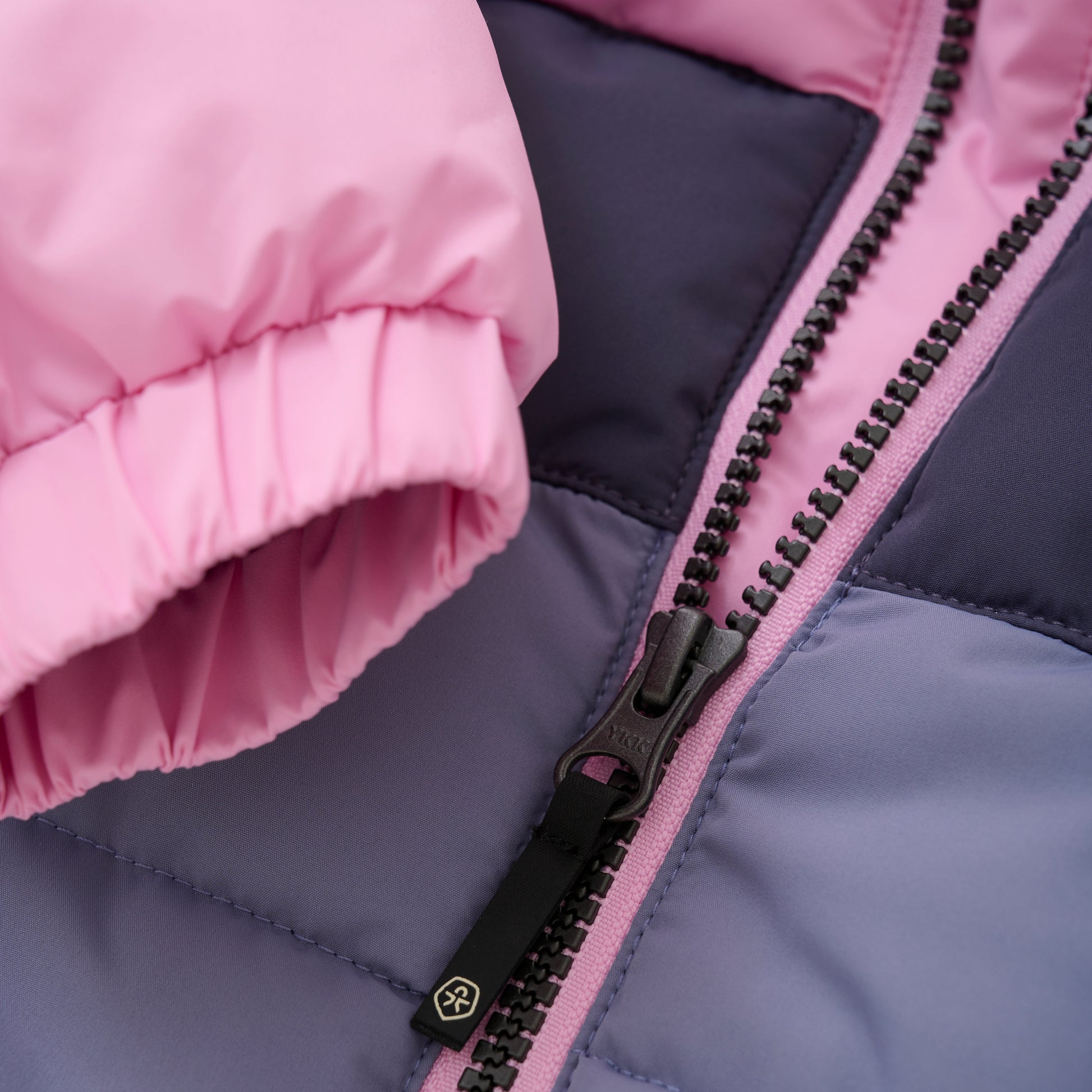 Warm quilted jacket with color block design in durable and partly recycled material. The material is breathable, windproof and waterproof, so your child can stay out in rain, snow and wind without getting cold and wet. Tested wear resistance of 20,000 rubs, water column pressure of 8,000 mm. and breathability of 3,000g. The jacket closes with quality zips at the front and at the outer pockets. The chin protector ensures that the zipper feels soft under the chin. The jacket has a removable hood. Reflective details on the back and on the sleeve for increased visibility. With inside name tag for easy identification. Coated with BIONIC FINISH® ECO. Certified acc. to GRS - Made with more than 50% Recycled Material