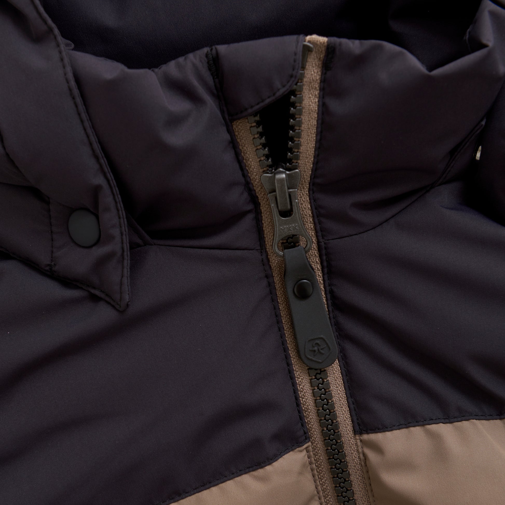 Warm quilted snowjacket for your child in durable material. The material is breathable, windproof and waterproof, so your child can stay out in the rain, snow and wind without getting cold and wet. Tested wear resistance of 20.000 rubs, water column pressure of 8,000 mm. and breathability of 3,000g.The jacket closes with a quality zipper at the front. Good inside wind pole. Chin protectors make sure that the zipper feels soft under the chin. The jacket has detachable hood and outside zip pockets. Reflective details on the back of the jacket and on the sleeve. Inner cuffs with hole for thumb. It has a name tag inside. The snowjacket is made of recycled material. Coated with BIONIC FINISH® ECO. Certified acc. to GRS - Made with more than 50% Recycled Material
