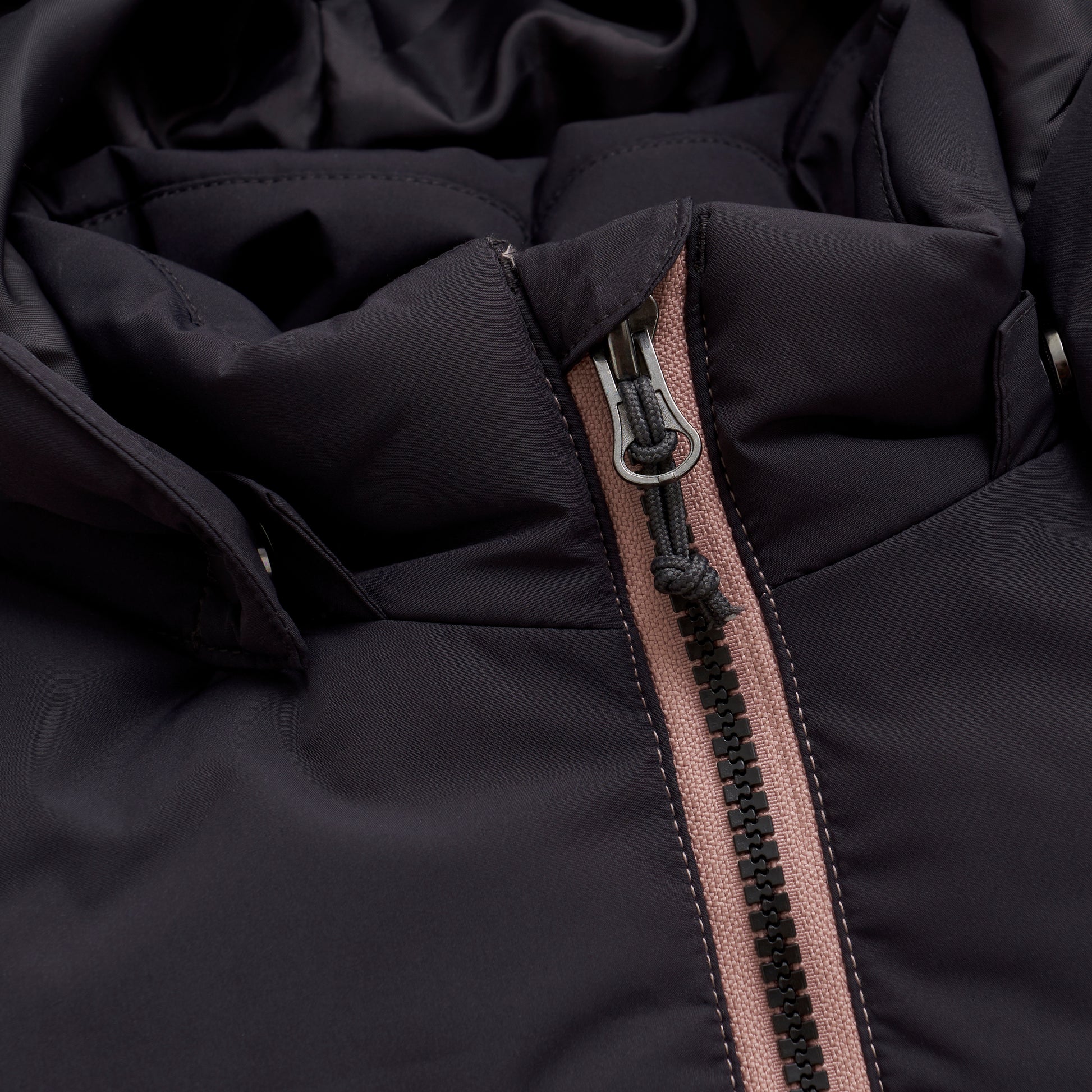 Warm quilted snowjacket for your child in durable material. The material is breathable, windproof and waterproof, so your child can stay out in the rain, snow and wind without getting cold and wet. Tested wear resistance of 20.000 rubs, water column pressure of 8,000 mm. and breathability of 3,000g.The jacket closes with a quality zipper at the front. Good inside wind pole. Chin protectors make sure that the zipper feels soft under the chin. The jacket has detachable hood and outside zip pockets. Reflective details on the back of the jacket and on the sleeve. Inner cuffs with hole for thumb. It has a name tag inside. The snowjacket is made of recycled material. Coated with BIONIC FINISH® ECO. Certified acc. to GRS - Made with more than 50% Recycled Material