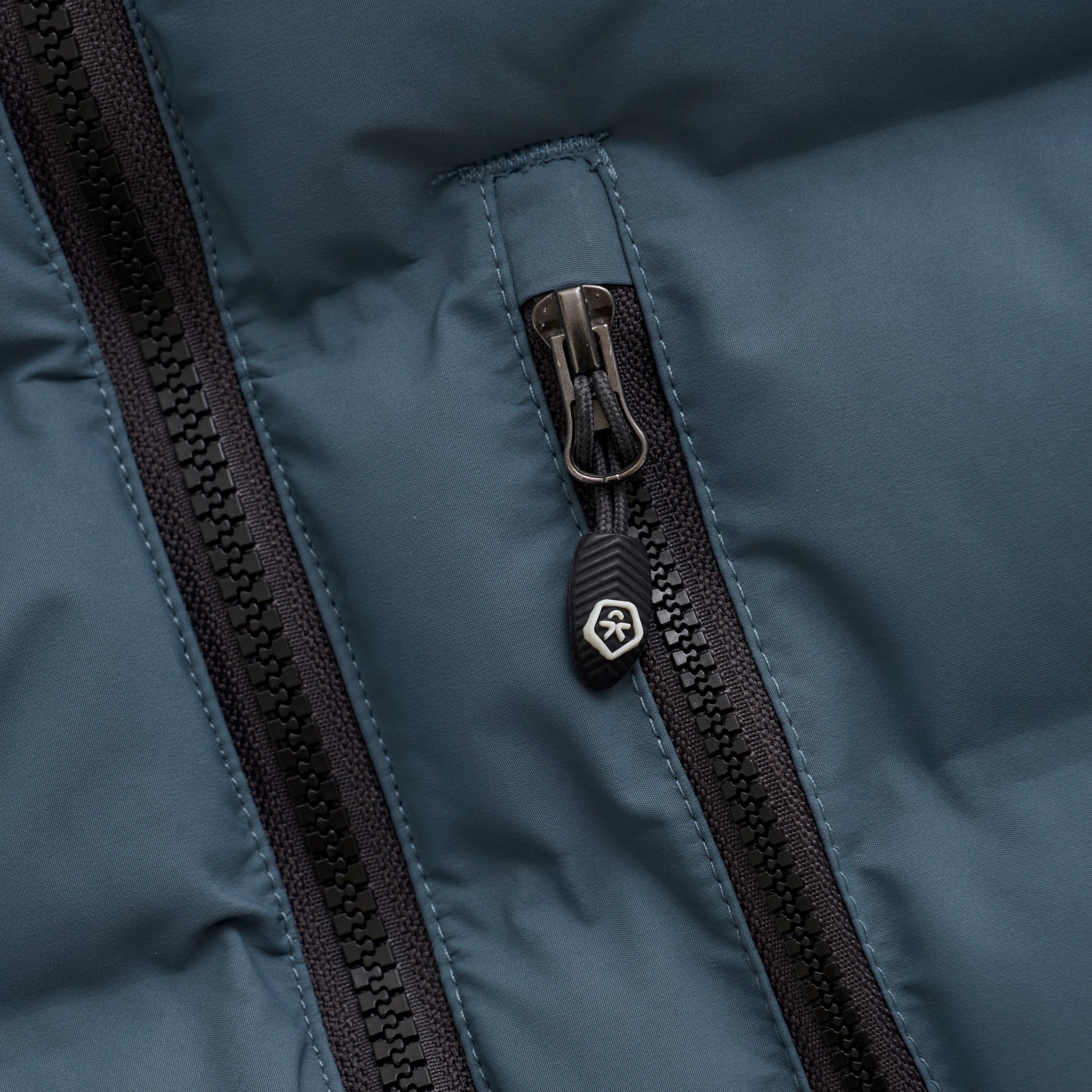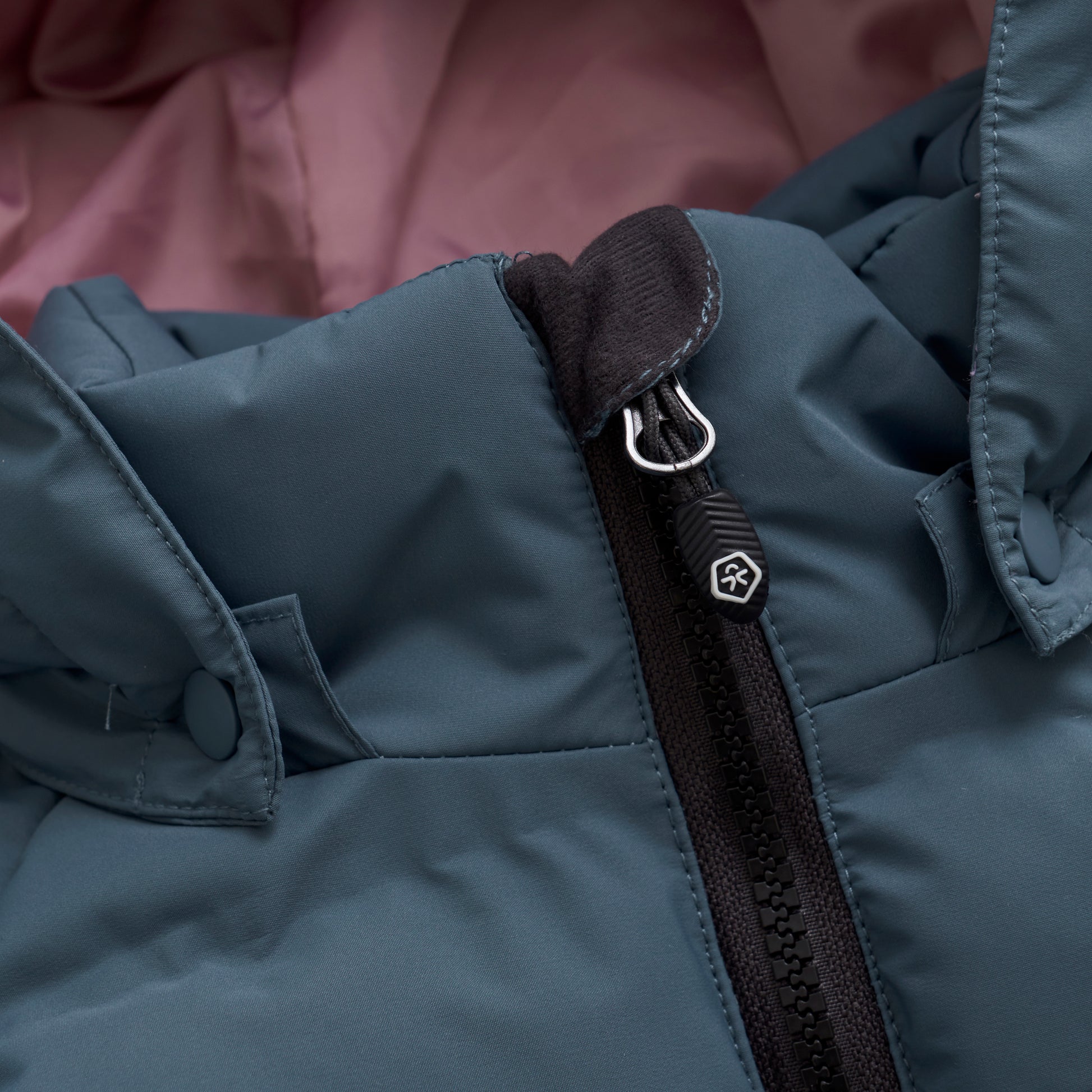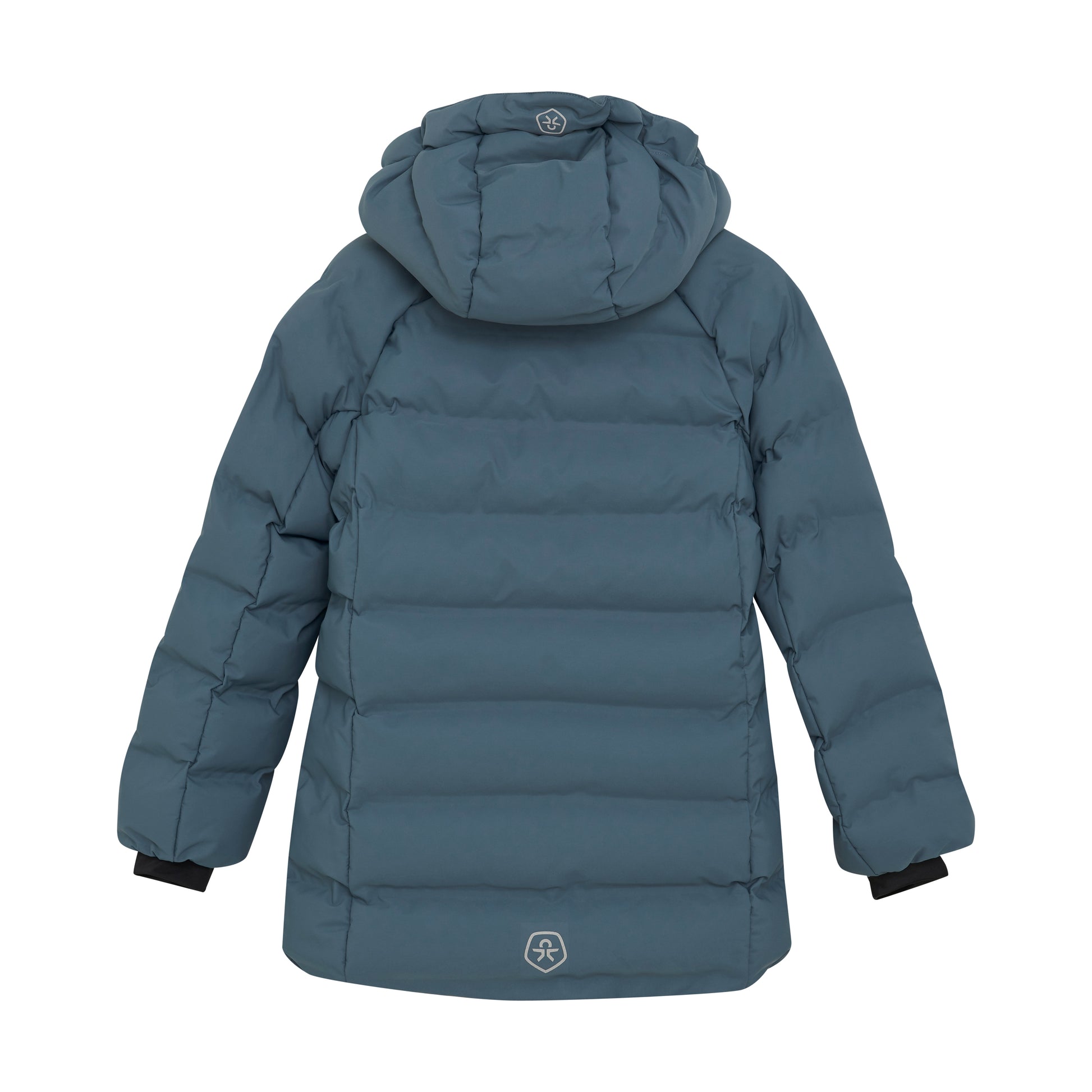 Warm tailored quilted jacket in durable and partly recycled material. The material is breathable, windproof and waterproof, so your child can stay out in rain, snow and wind without getting cold and wet. Tested wear resistance of 30,000 rubs, water column pressure of 10,000 mm. and breathability of 3,000g. The jacket closes with quality zips at the front and at the outer pockets. The chin protector ensures that the zipper feels soft under the chin. The jacket has a removable hood. Reflective details on the back and on the sleeve for increased visibility. With inside name tag for easy identification. Coated with BIONIC FINISH® ECO. Certified acc. to GRS - Made with more than 50% Recycled Material