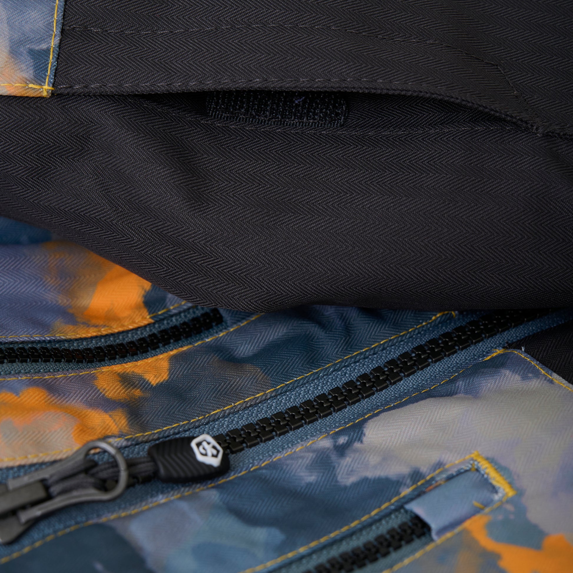 The jacket closes with a quality zipper at the front. Chin protectors make sure that the zipper feels soft under the chin. The jacket has detachable hood and outside zip pockets. Reflective details on the back of the jacket and on the sleeve. Other practical features such as inner cuffs with space for the thumb and adjustable outer cuffs that can be closed tightly. Pocket for lift passes in the left sleeve and inner snowskirt with snaps at the bottom. It has a name tag inside.