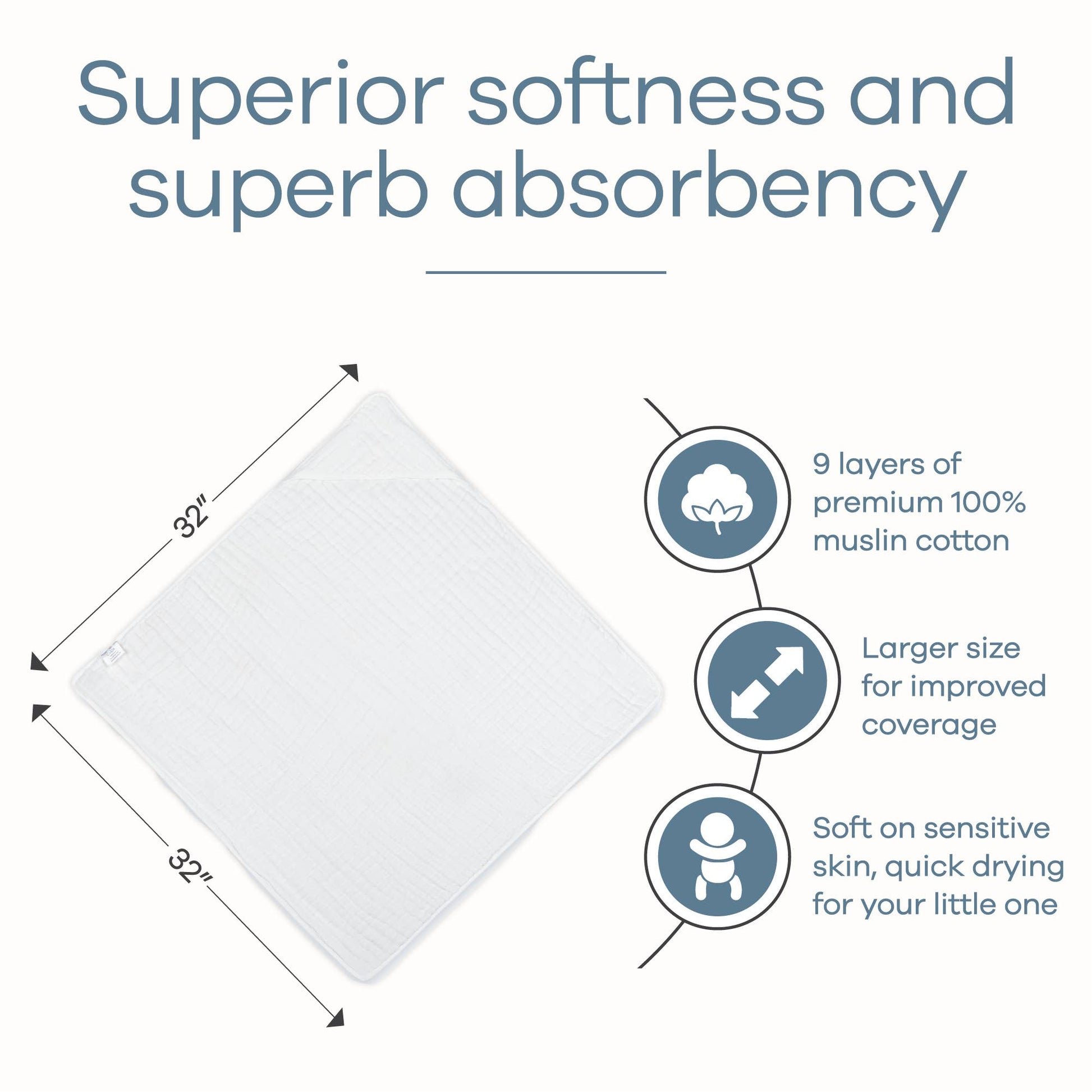 - Larger Size for Better Coverage – Comfy Cubs muslin cotton hooded towels are a bigger 32” x 32” in size which helps support newborn infants and growing toddlers, so they can enjoy better coverage from their heads to their little bottoms.