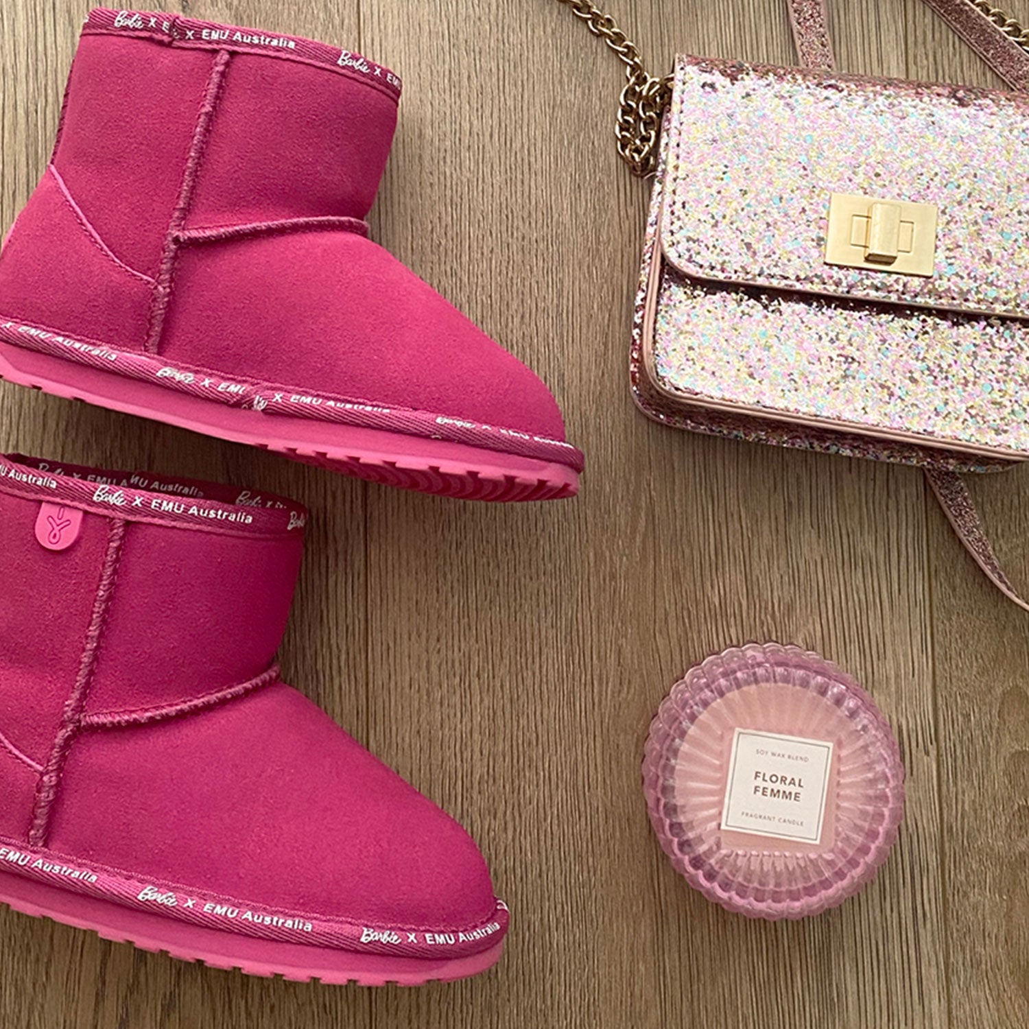 Drawing from the Women’s collab collection is the fun yet practical BarbieTM Wallaby Mini kids boot.
