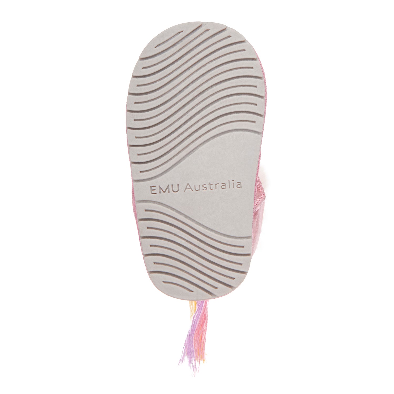 The EMU Australia Little Creatures Magical Unicorn Walker is a fantastical boot for babies and toddlers. Lined with natural, soft and fluffy Australian Merino wool they keep tiny feet perfectly warm and comfortable. Character details include a rainbow horn and tail, and applique ears, eyes and nose. The velcro fastening ensures easy foot access, while the soft moulded rubber sole unit offers support, grip and flexibility.
