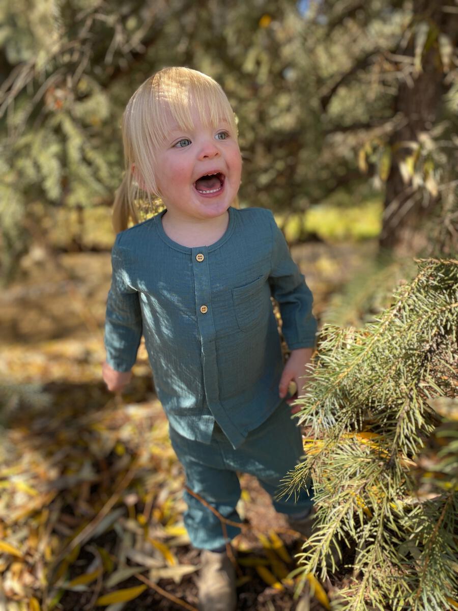 This vibrant gauze top has a bit of a stretch to it, great for little adventurers! This top has a smart breast pocket and hidden bottom buttons.