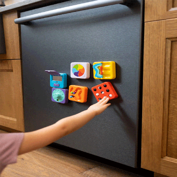 Grab the board (sold separately) and then choose from the unique tiles (available in packs of 3). There's a set of gears that spin together, textured buttons that squeak, colorful balls that roll through a maze, a dial that clicks from one to ten... They all magnetically snap onto the board any way you want. Or, you can just throw a few in the diaper bag, or even stick them to the fridge! The classic activity board becomes more versatile and more open-ended with PlayTab.