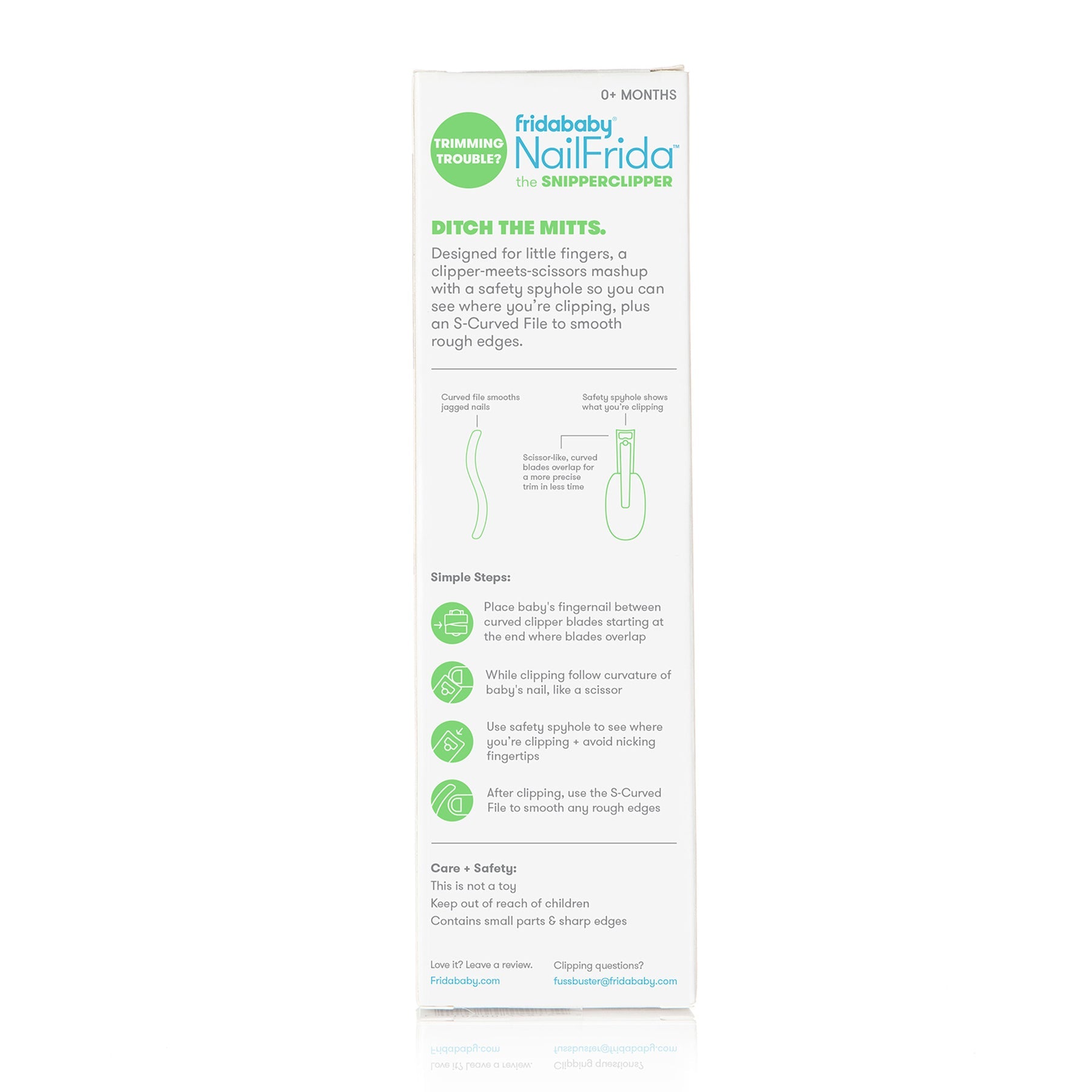 Tackle all of your trimming troubles without nicking baby's sensitive skin with the NailFrida SnipperClipper Set. See what you're snipping through the safety spyhole and nail that mani/pedi every time. NailFrida's specially curved blades mimic the shape of baby scissors and are uniquely designed for smooth and silent snipping. Smooth sharp corners with the curved S-file that's shaped just for baby—a must for newborn care.