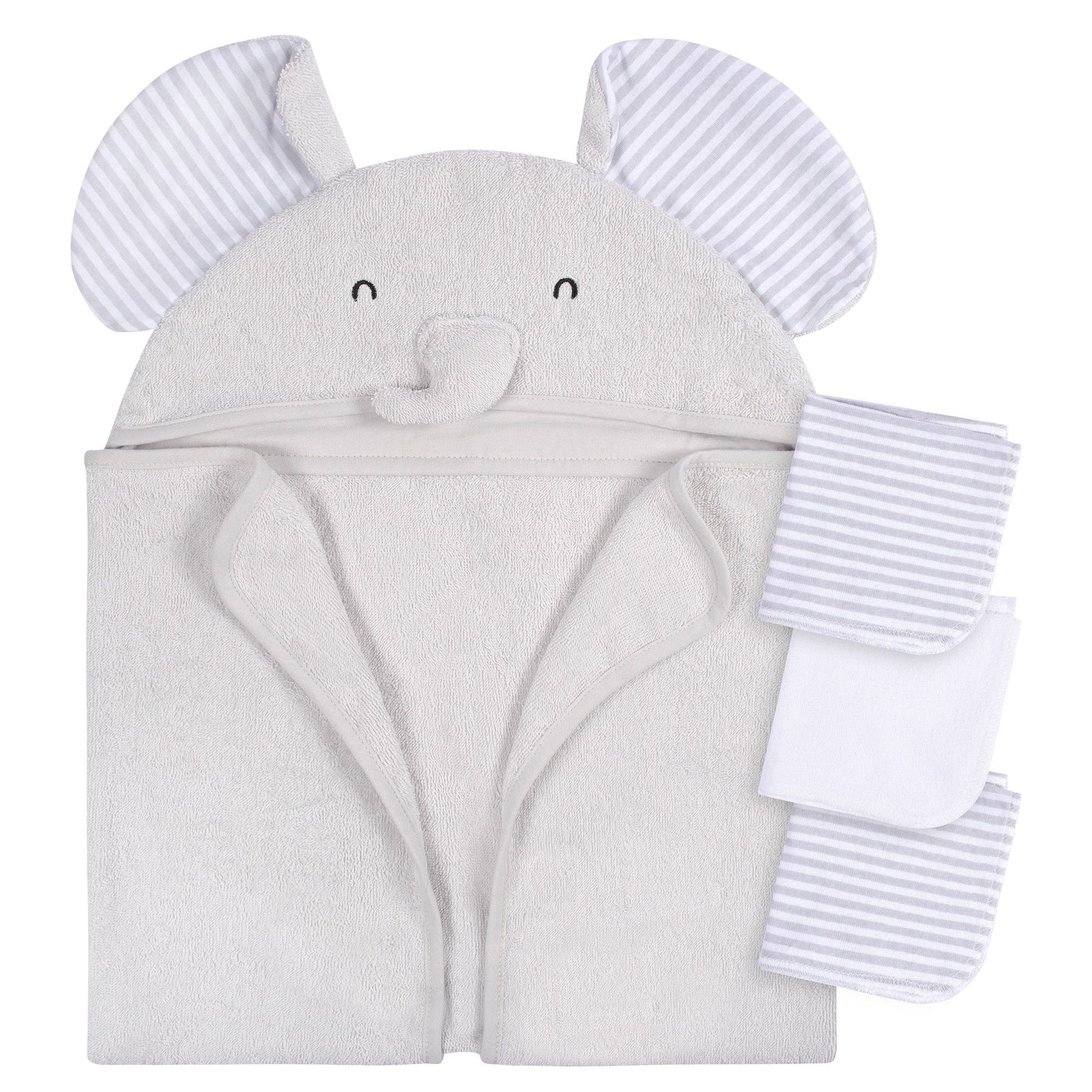 Wrap your little one in snuggly softness with our charming baby towel! Featuring an adorable shark hood, this robe is crafted from woven terry cotton, ensuring your baby stays cozy and comfy after bath time. This set also includes three matching washcloths made from a cotton and polyester knit terry, perfect for gentle cleaning. Our essentials have been independently certified with STANDARD 100 by OEKO-TEX® so that you don’t have to worry about harmful substances in your baby’s wardrobe. This pack includes one towel and three washcloths.