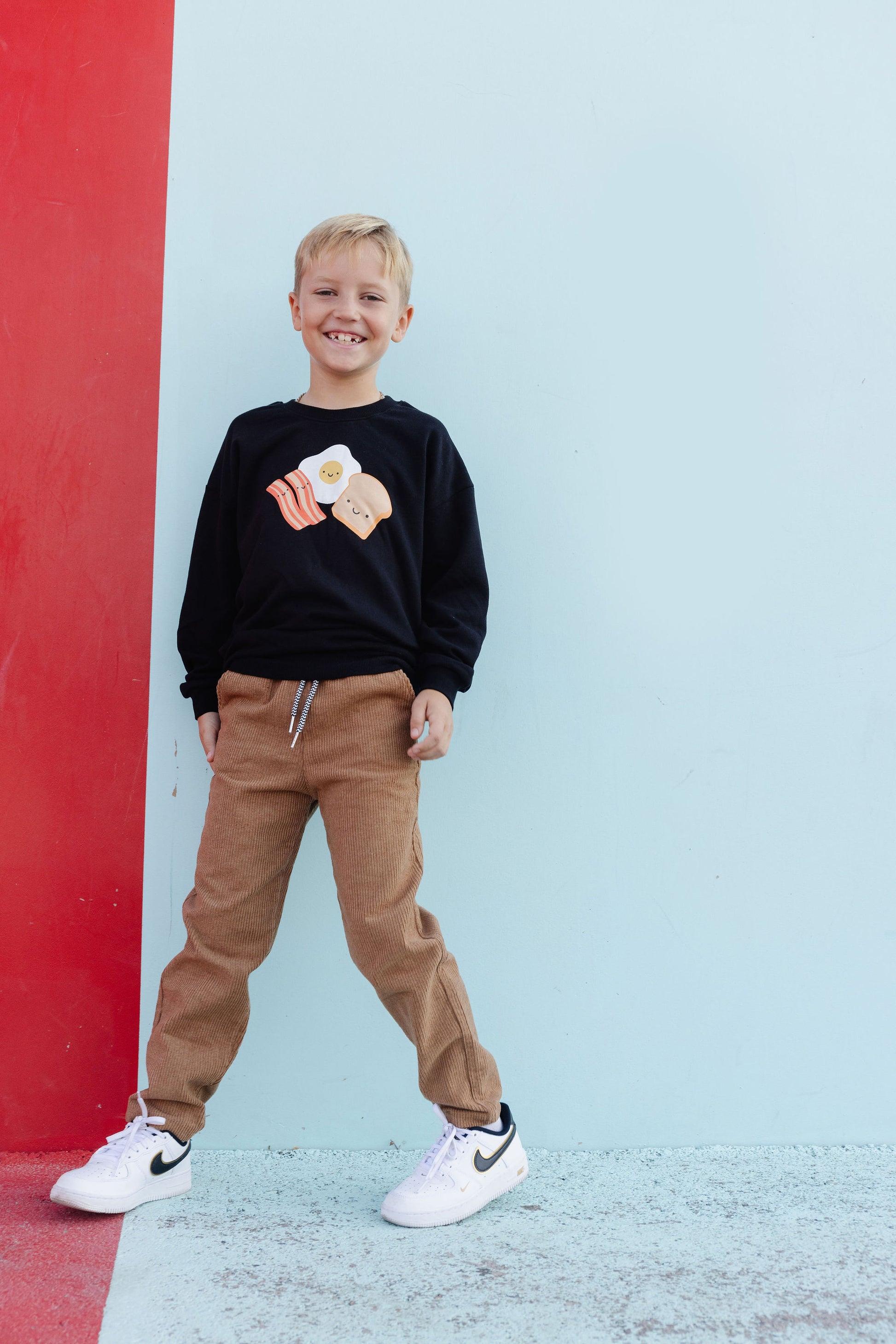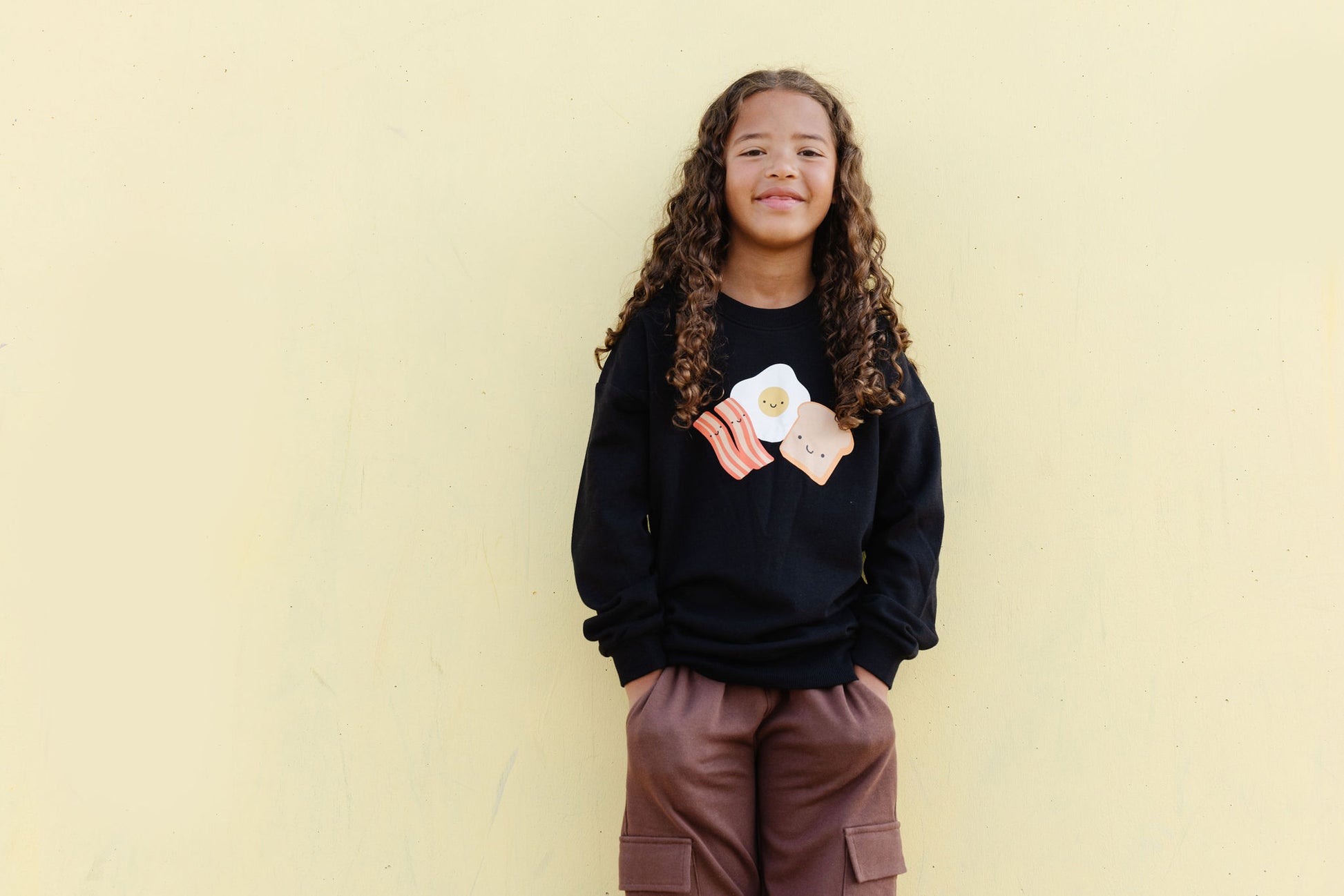 Breakfast lovers, unite! Whether it's breakfast, brunch or breakfast for dinner, love to eat it and now you can wear it too! This sweater is bound to resonate with foodies of all ages. It will have you singing "Fried Egg, I'm in Love." Whistle & Flute clothes are designed to be Playful, Unisex and Cool. Using the softest fabrics and safest inks; so your kids can be comfortable at all times. Focusing on quality so they can be worn for years to come!