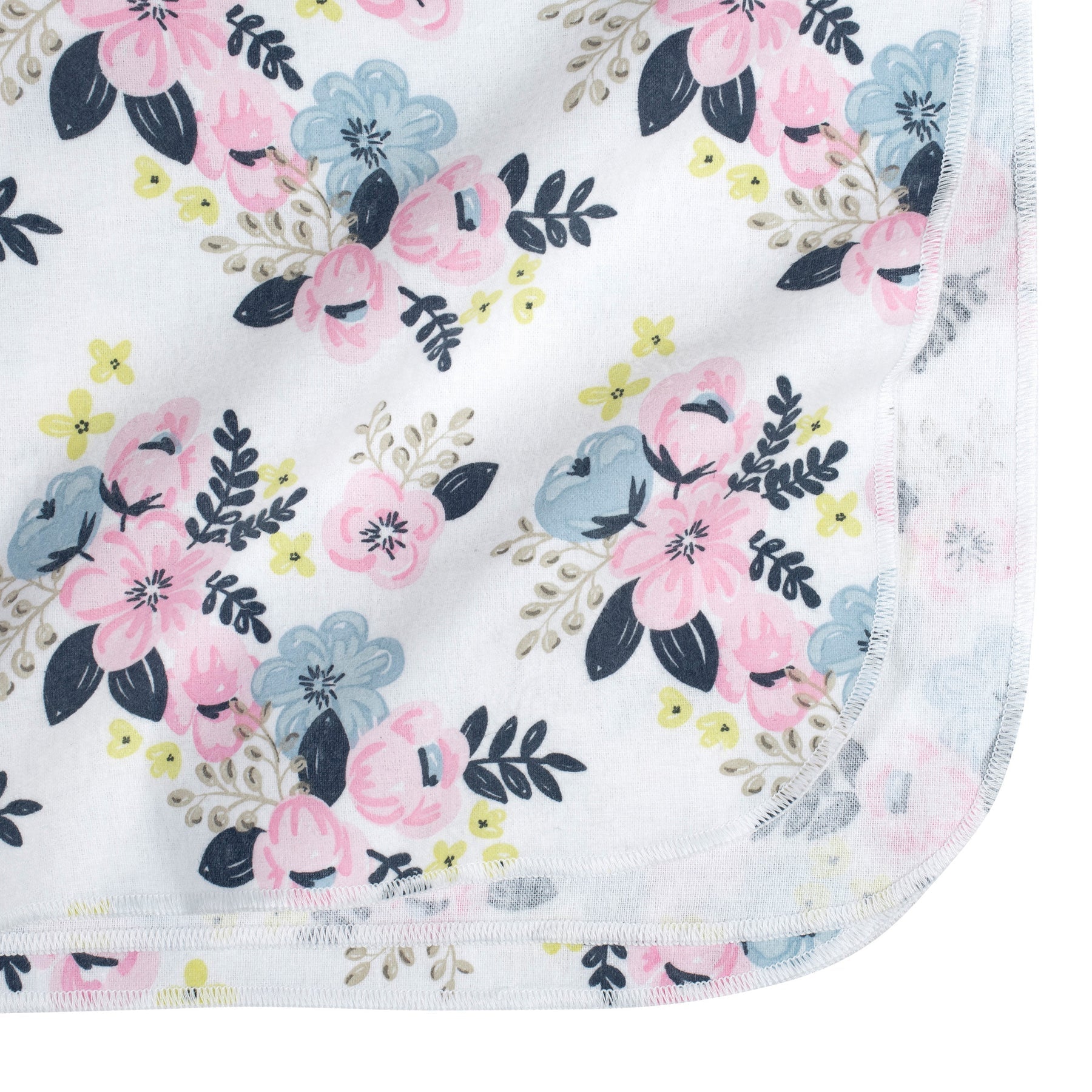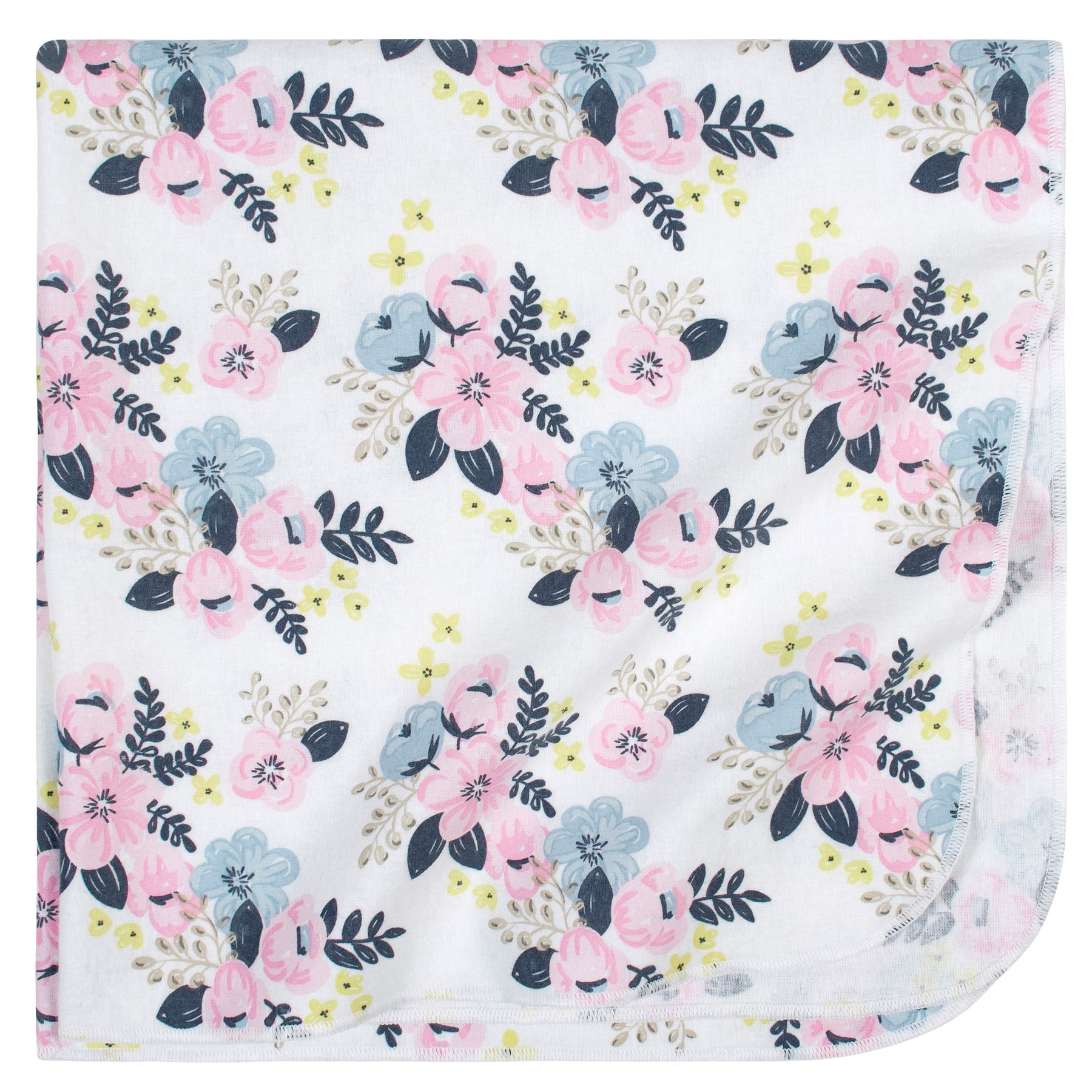 The Just Born Floral Flannel Receiving Blankets provide versatility for your baby's busy life. Pack of soft coordinated blankets each feature a blossoming floral print, crafted of cozy cotton flannel for soft comfort and warm snuggles.