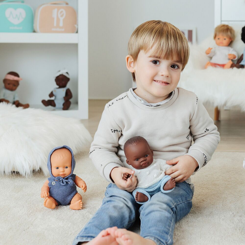 Miniland produces doll clothing at their premium garment facility by hand. Every doll's outfit looks and feels like the clothes you wear - with functioning buttons, zippers, velcro, and premium materials such as wool and cotton to make these outfits look as good as the dolls themselves