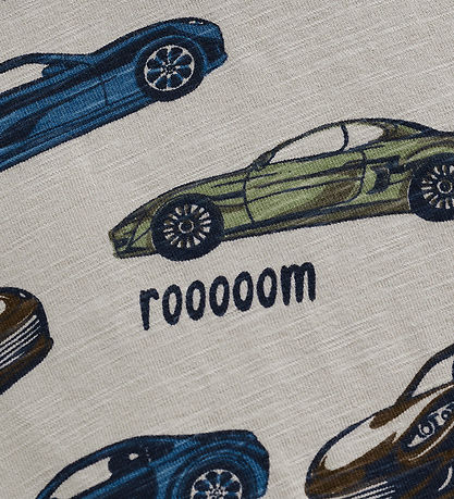 Cool Minymo blouse in beige with an allover print of racing cars in blue, brown and red shades with text print in black. The Blouse has a round neckline with push buttons at the left shoulder and long sleeves.