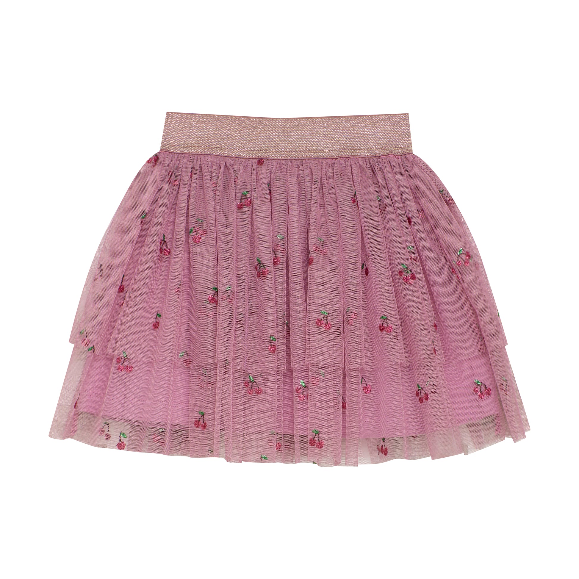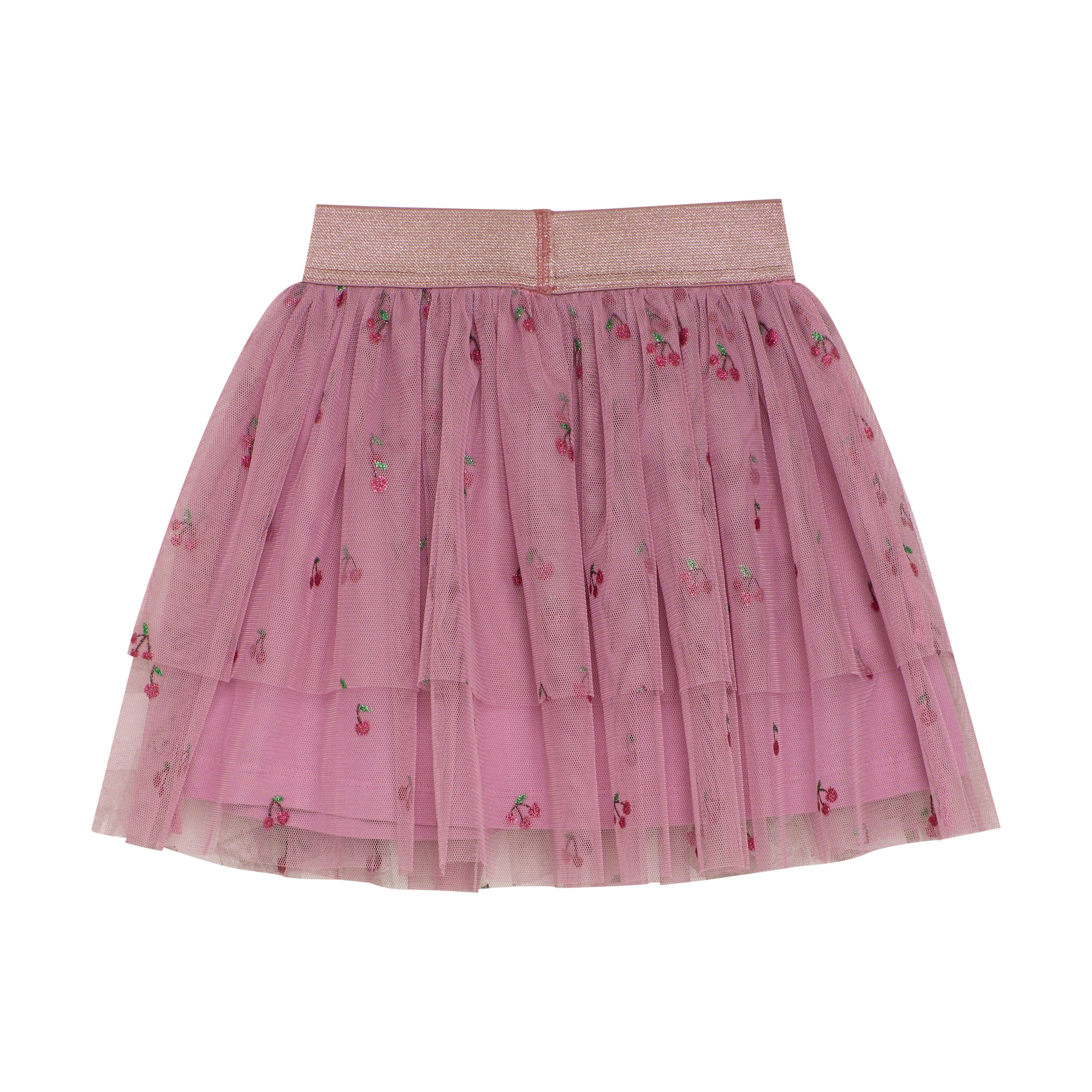 Tulle skirt adorned with beautiful glitter cherries and a glittery elastic waistband, perfect for festive and elegant occasions.