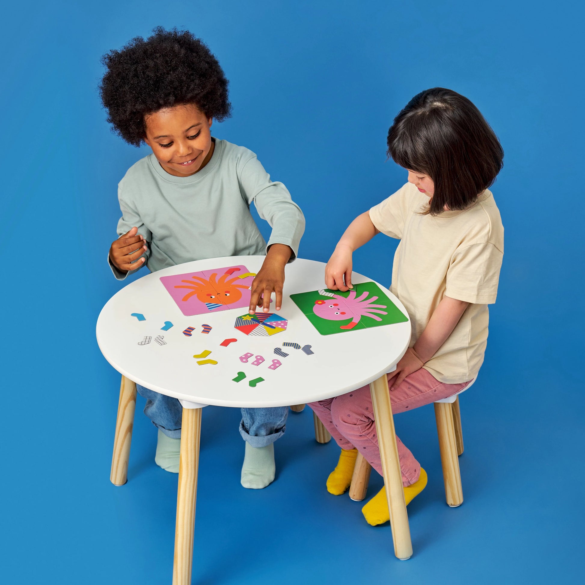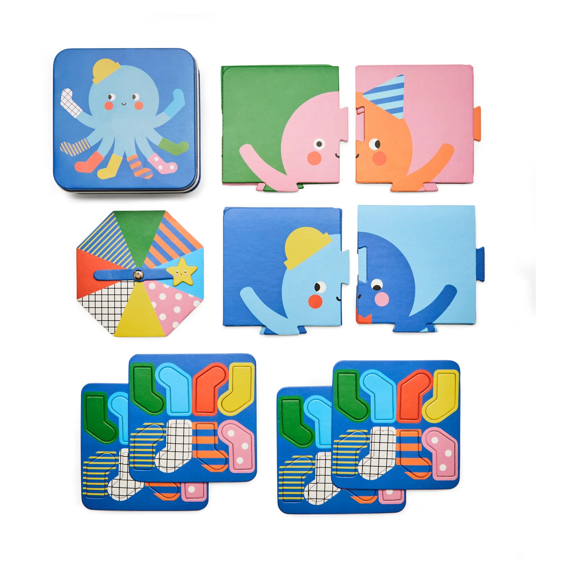 Ideal for on-the-go! Take turns to spin the wheel and grab the matching print sock to dress your octopus!