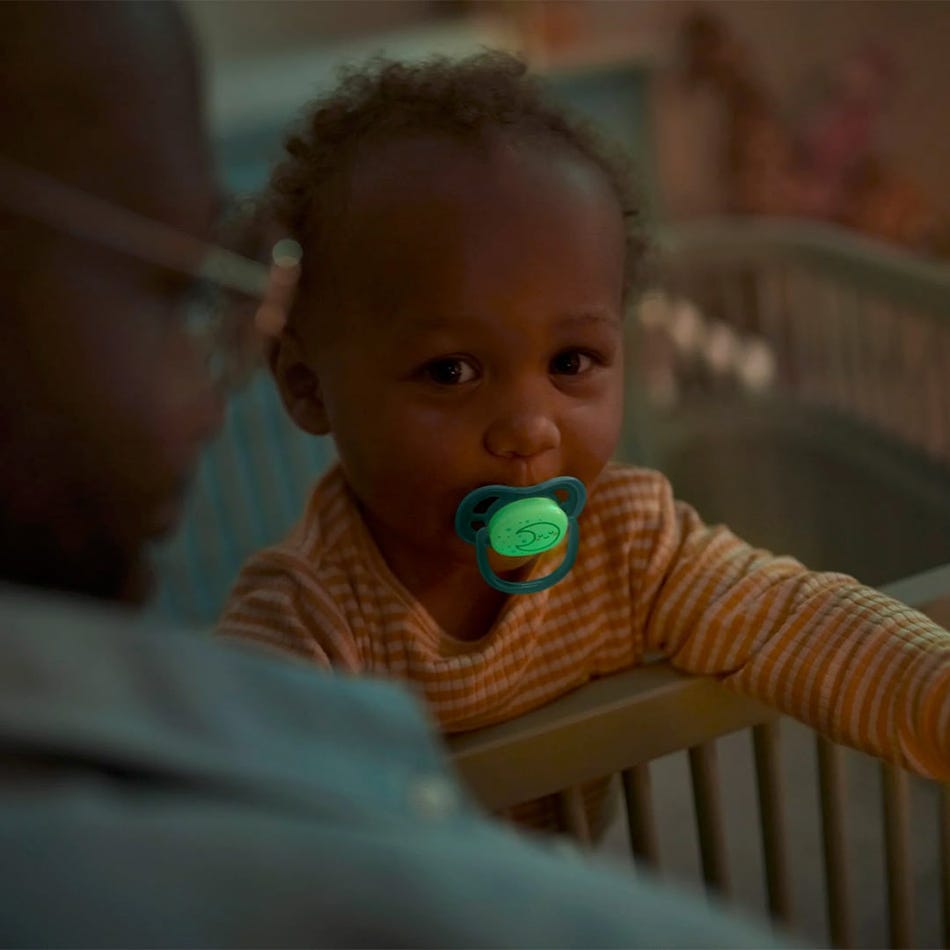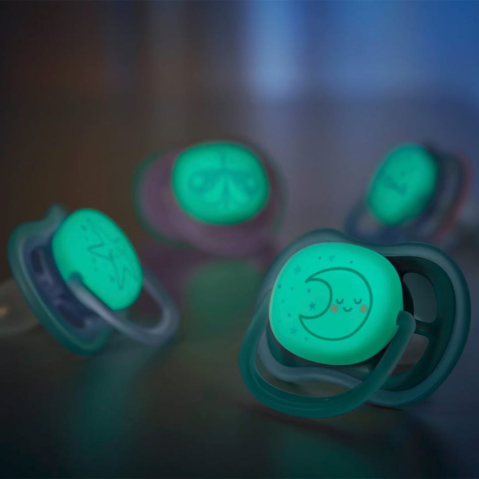 The Philips Avent Ultra Air pacifier for babies 6-18 months has a long lasting glow, so it's easy to find in the dark. It's designed with a lightweight, breathable shield for baby's sensitive skin.