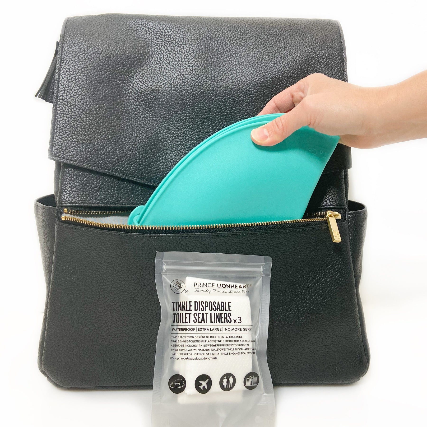 We understand, all too well, the dread of nature's call when you are out and about with your little potty trainer. There is nothing more cringe-worthy than watching their tiny hands and bare legs dangle on a disgusting public toilet seat. Prince Lionheart's Tinkle® To Go takes your dread away with this simple, compact potty training solution that can be used with any toilet, but was specifically designed for ucky public ones. Throw a paper barrier down and place the tinkle to go on top for a stable, comfy base that prevents any uck from coming in contact with your potty trainer. Other foldable potty seats that are hard plastic, attach with suction cups, and have exposed seams that can pinch tiny bottoms. The Tinkle To Go's patented design is made of super soft, seamless material that is comfy, skin friendly, and also grips to any surface -- toilet seat or paper liners -- without any pinch points. When finished, it folds quickly and compactly, fitting inside a reusable, machine washable carry bag. 3 paper barrier covers included; refills sold separately. Keep the germs at bay and your sanity intact!
