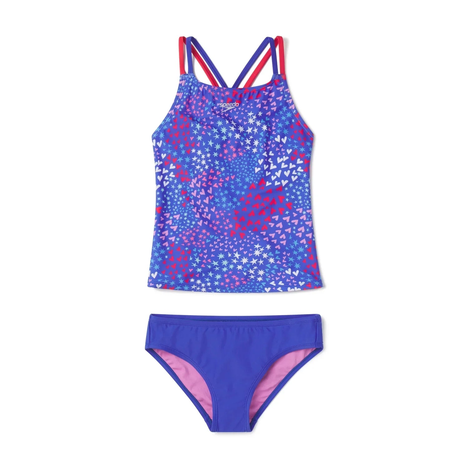 A durable two-piece set with a fun appeal and wearability girls love. Featuring a bright printed top with a scoop neckline and a double-strap design. Made from recycled fabric and built-in sun protection Blocks the Burn with UV 50+, while a solid bottom completes the sporty look and makes mixing and matching easy.