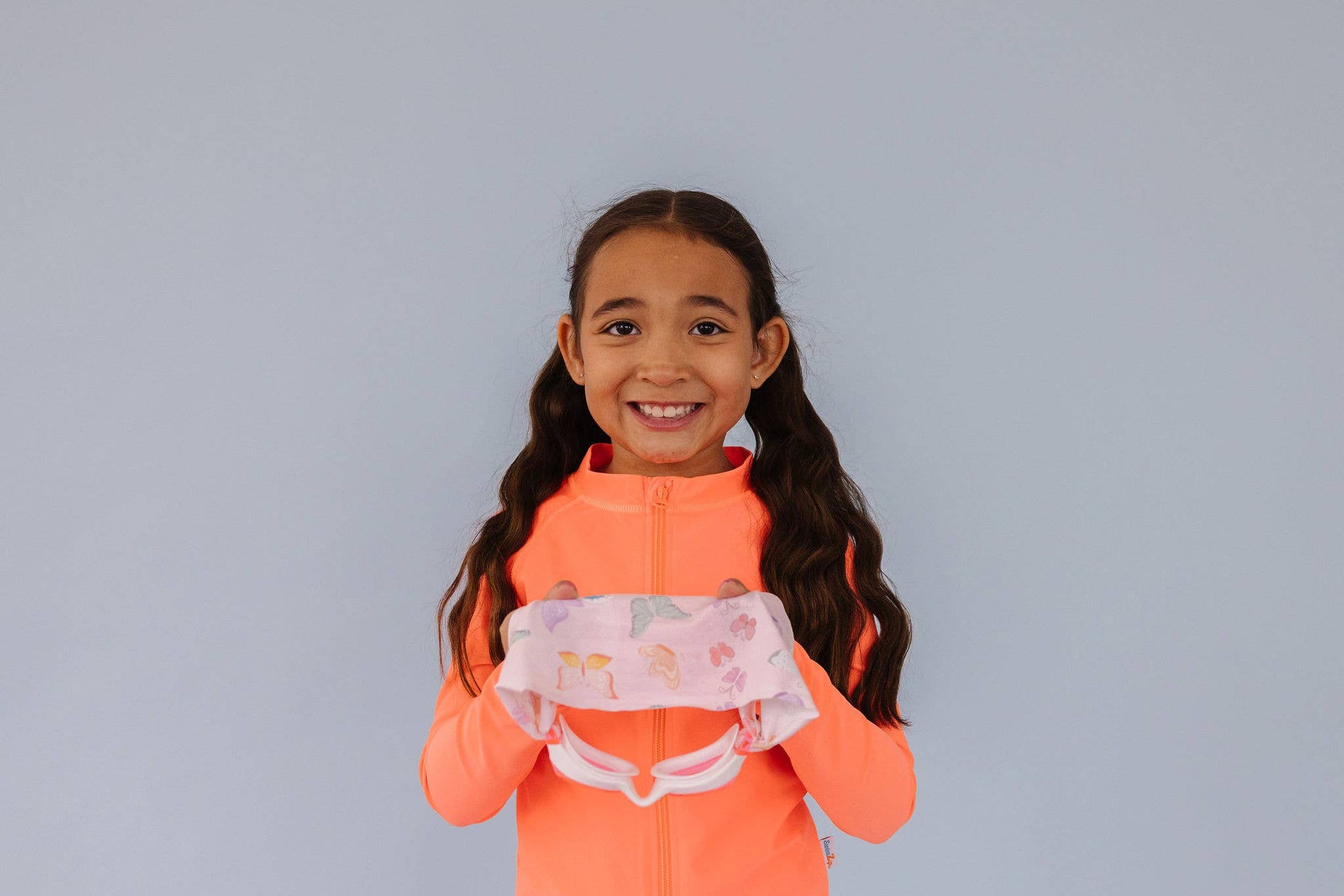 Our Flutter swim goggle features our tangle-free strap in an array of pretty butterflies on light pink and peach background, paired with a white frame and lightly tinted pink lenses.
