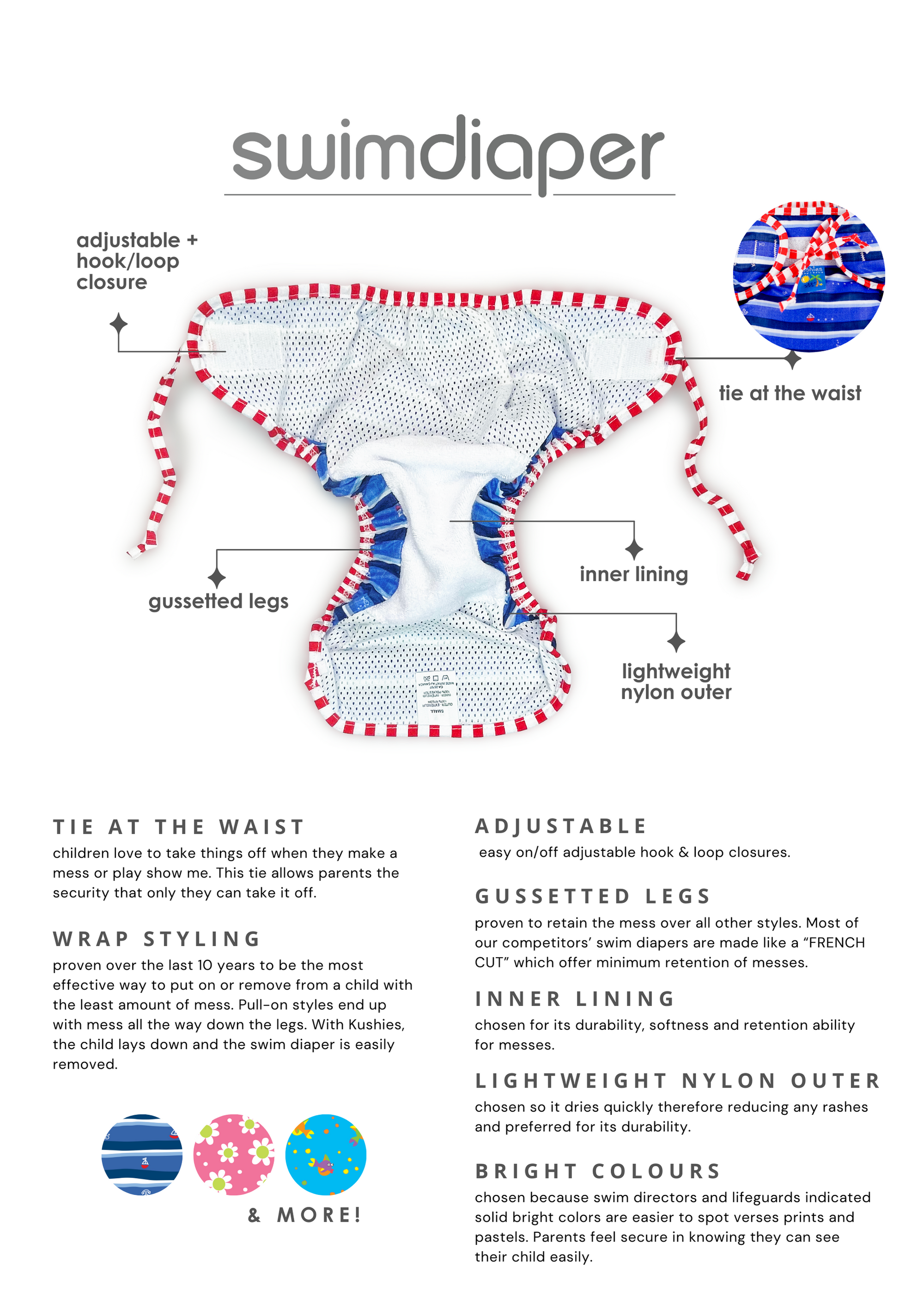 With quick drying nylon and a soft terry liner for comfort, the wrap style design makes it easy to change your little one while the adjustable waist with added ties ensures a secure fit every time.