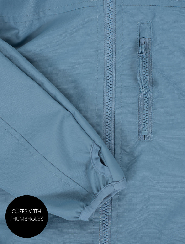 - Elasticated cuffs with thumbholes to cover hands in rain and wind.