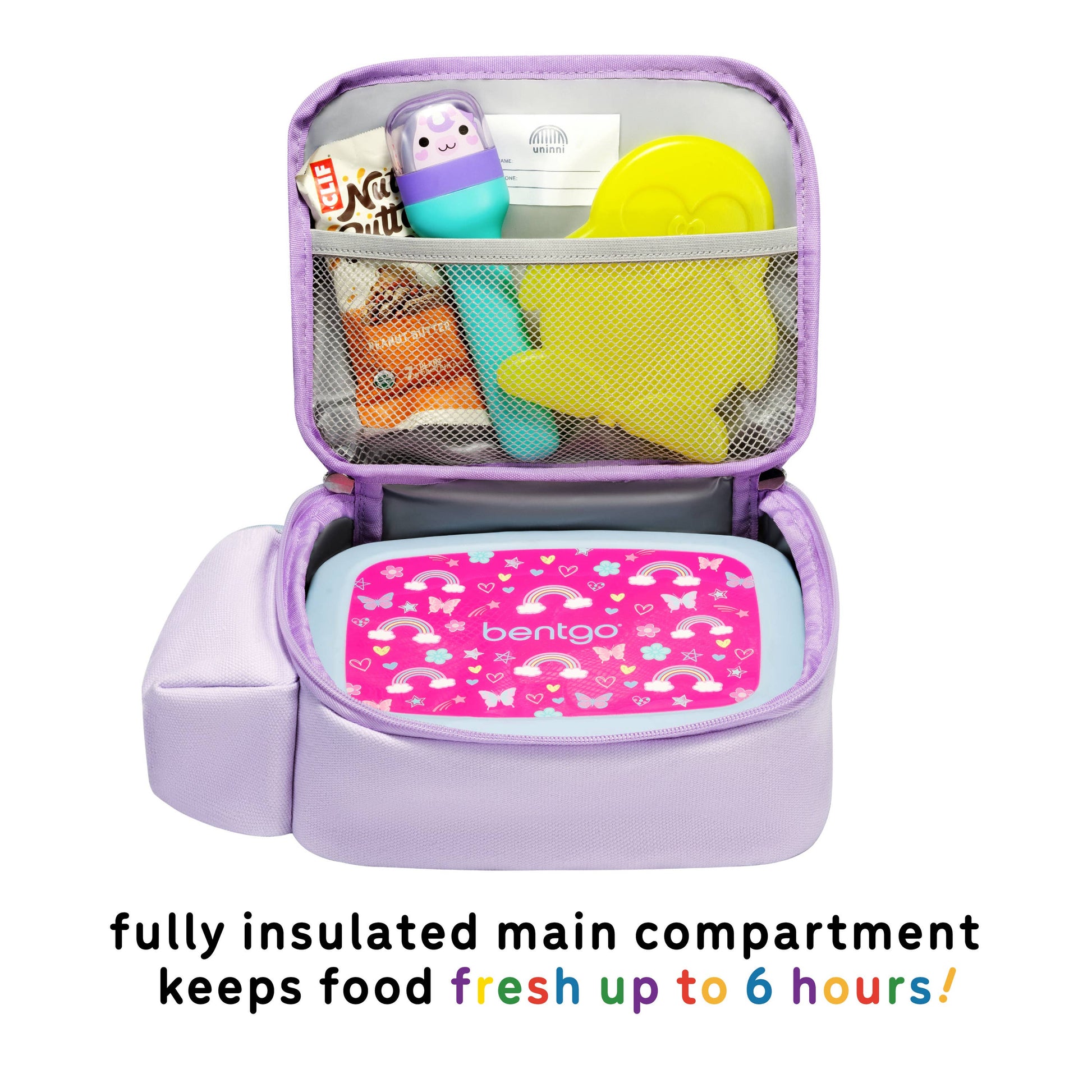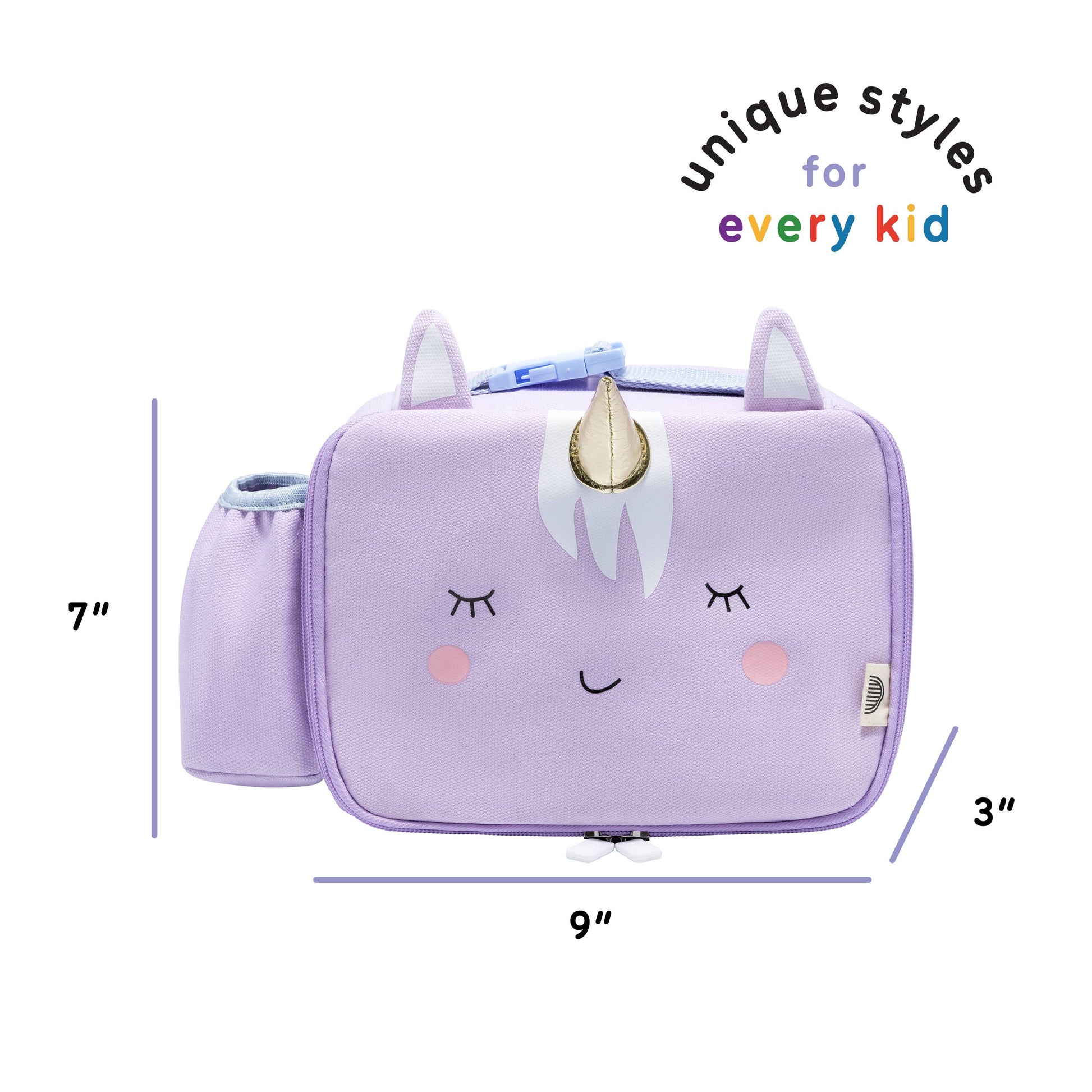 Features: - Fully Insulated Main Compartment: Keep food fresh for hours in the fully insulated, zippered main compartment designed to fit a variety of kids bento boxes, including Bentgo boxes Padded Handle: The soft padded handle making carrying and hanging the lunch bag a breeze. - Versatile Storage: The bag includes an interior mesh compartment for silverware, back zippered pocket for extra snacks, and side compartment for water bottles - High Quality Materials: Made with light weight, easy to clean, BPA-free materials and a water-resistant interior. Dimensions: 9” tall, 7” wide, 3” deep. - Unique Design: Every child will love the animal face design, complete with 3-dimensional details to stand out.